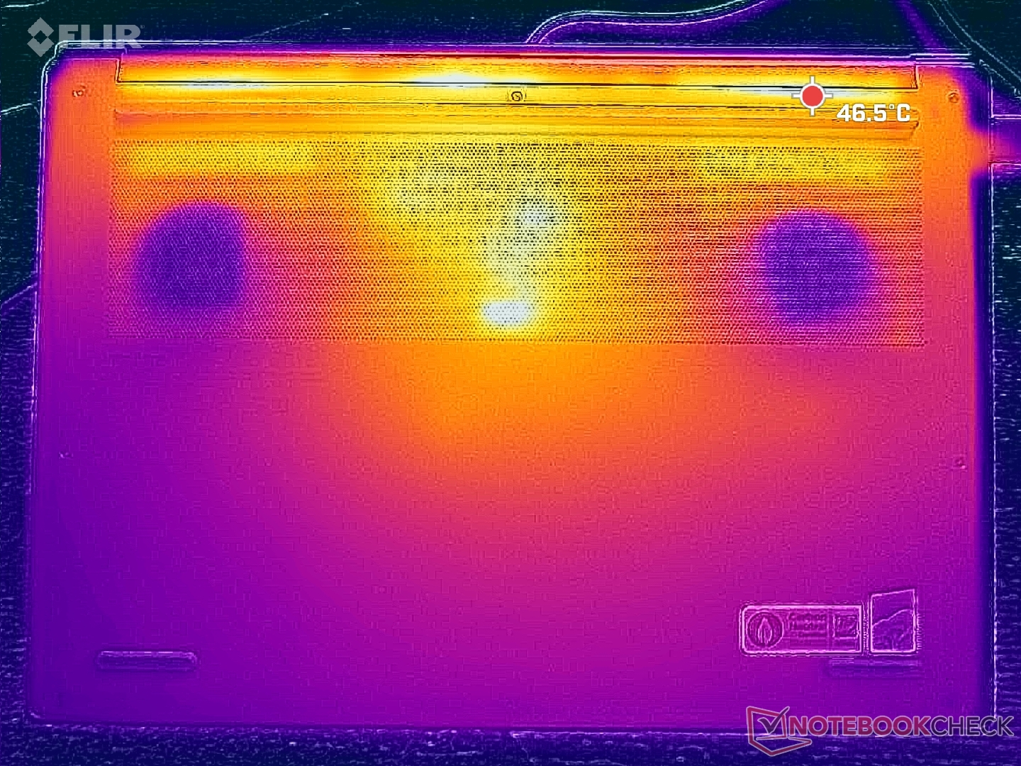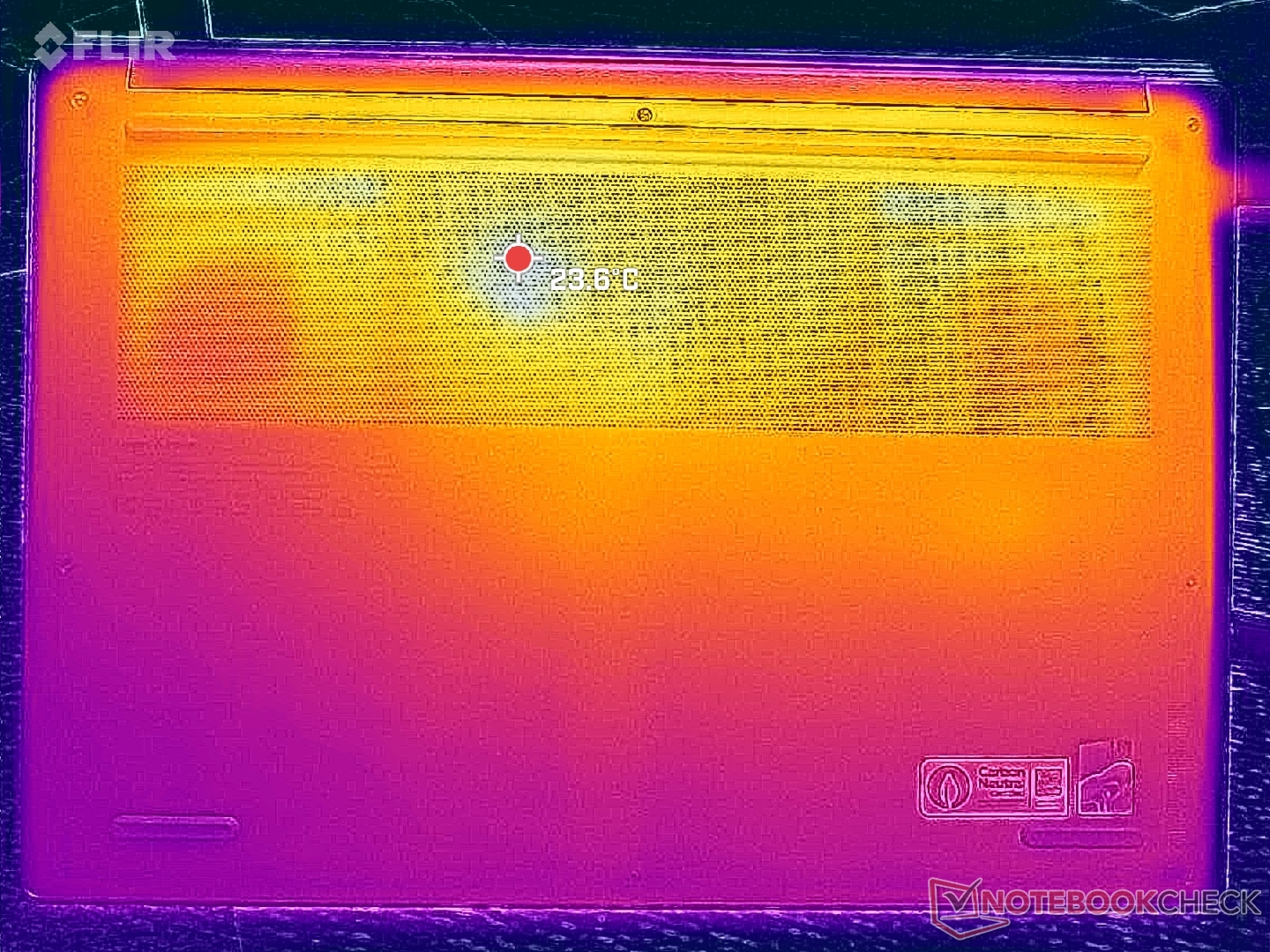 Le temperature di superficie durante l'esecuzione di carichi impegnativi sono notevolmente più fredde rispetto a quelle registrate sulla configurazione RTX 5070. I punti caldi durante il funzionamento al minimo di Cyberpunk 2077 raggiungevano poco più di 35 C e 42 C sul piano tastiera e sul coperchio inferiore, rispettivamente, rispetto ai 42 C e 46 C dell'unità RTX 5070 più veloce.