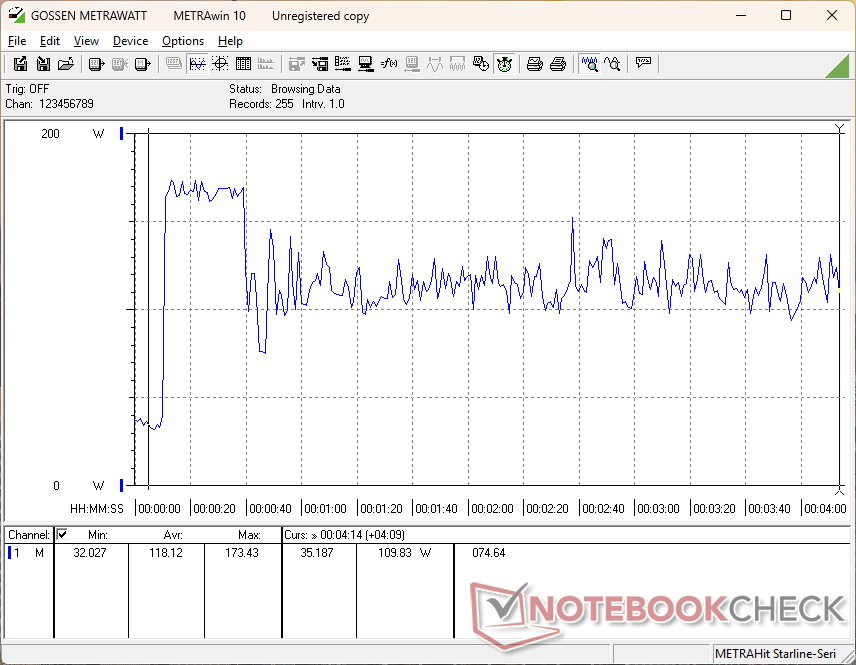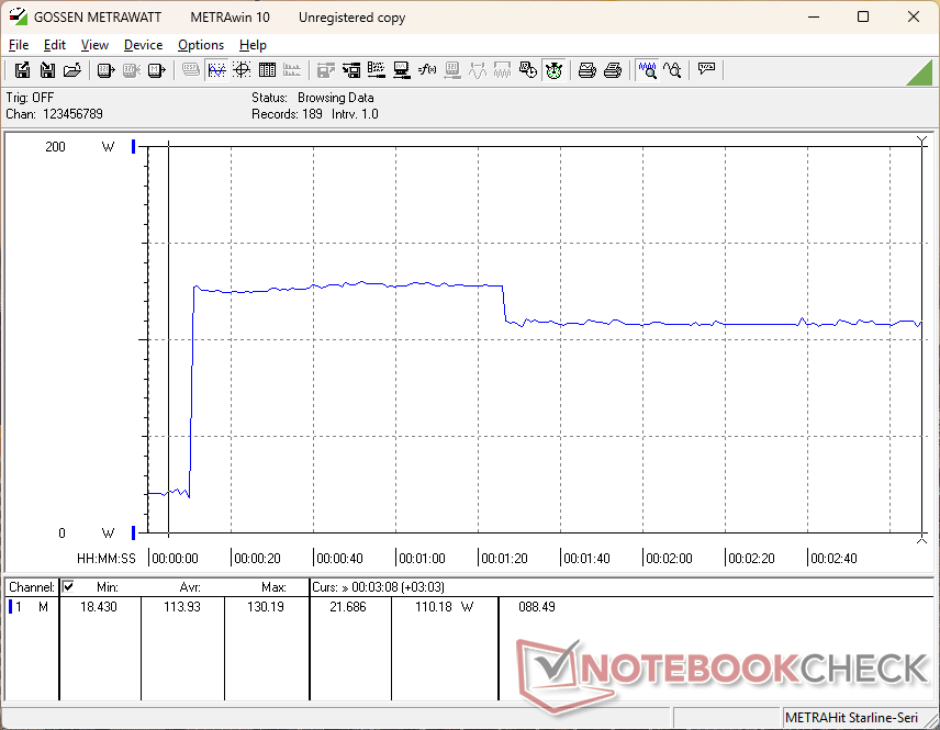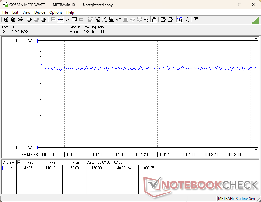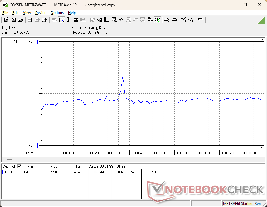 Il consumo può arrivare a 7 W in modalità iGPU con lo schermo impostato sulla luminosità minima o a oltre 22 W in modalità dGPU e luminosità massima. Quando si gioca, tuttavia, il sistema consuma solo pochi watt in meno rispetto alle opzioni RTX 5060 o 5070, molto più veloci. L'aggiornamento alla configurazione RTX 5060, ad esempio, consumerebbe solo il 6% in più di energia per prestazioni di gioco più veloci del 20-30%.