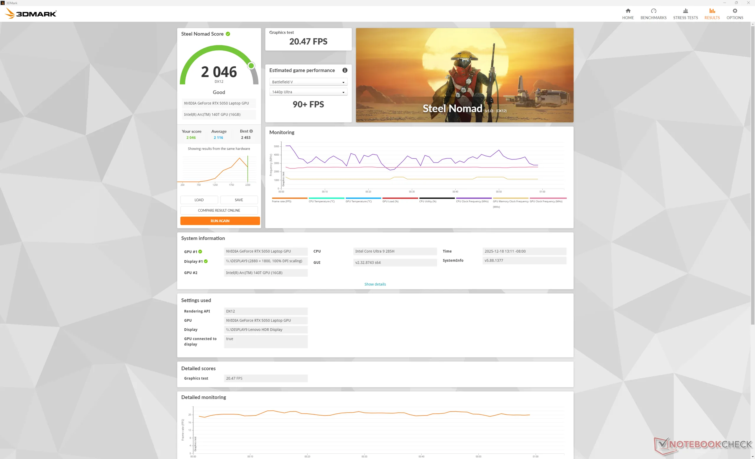 Ancora peggio, optare per la configurazione RTX 5050 non significa necessariamente una maggiore durata della batteria o ventole più silenziose durante il gioco o l'esecuzione di carichi pesanti, nonostante le prestazioni più lente. Il Core Ultra 9 285H non offre nemmeno una grande spinta rispetto al più economico Core Ultra 7 255H, ma le SKU con quest'ultima CPU sono purtroppo più difficili da trovare negli Stati Uniti. Le temperature di esercizio possono essere più fresche, ma questo leggero vantaggio impallidisce rispetto alla lunga lista di svantaggi rispetto alla più valida opzione RTX 5060.
