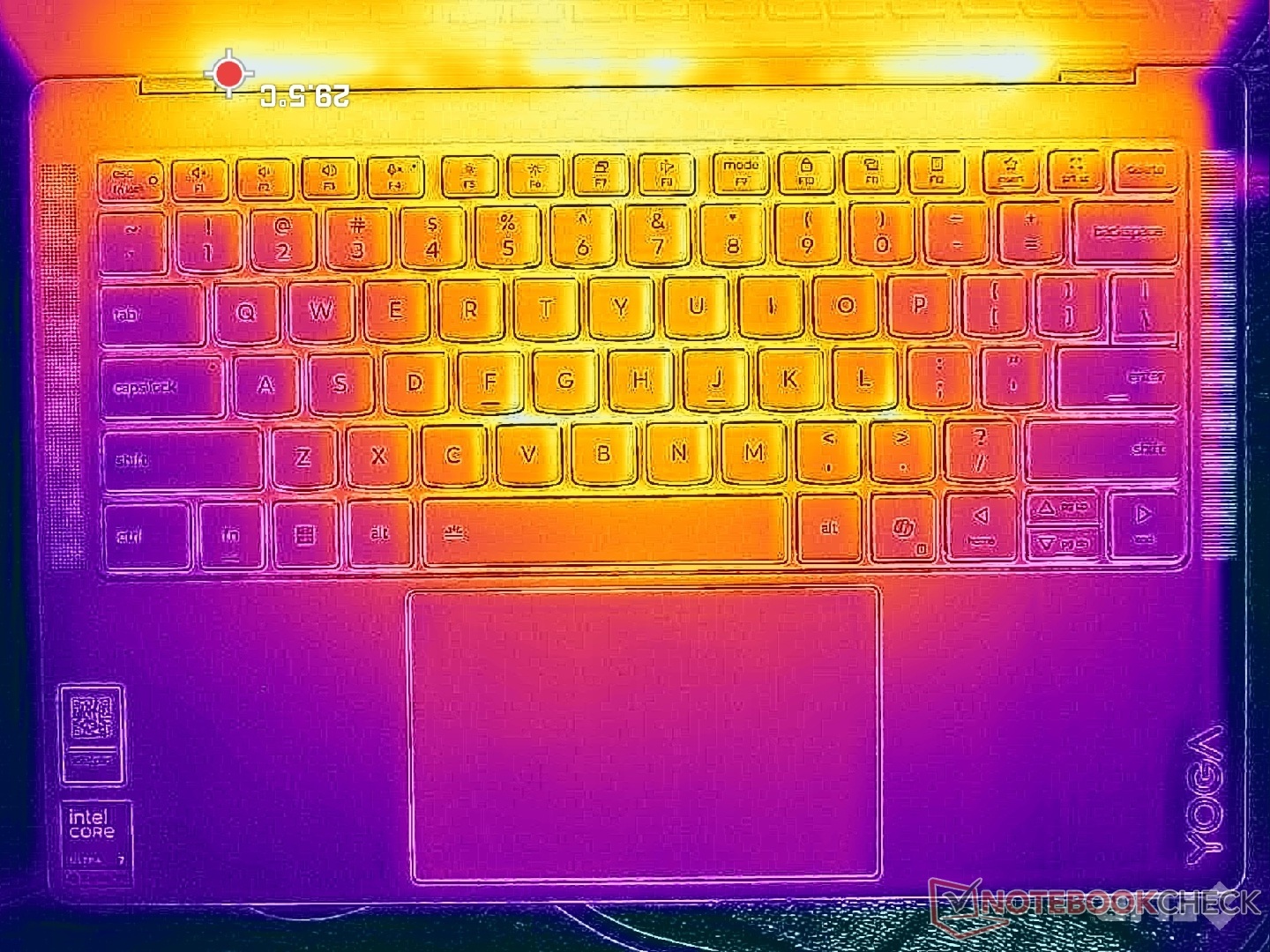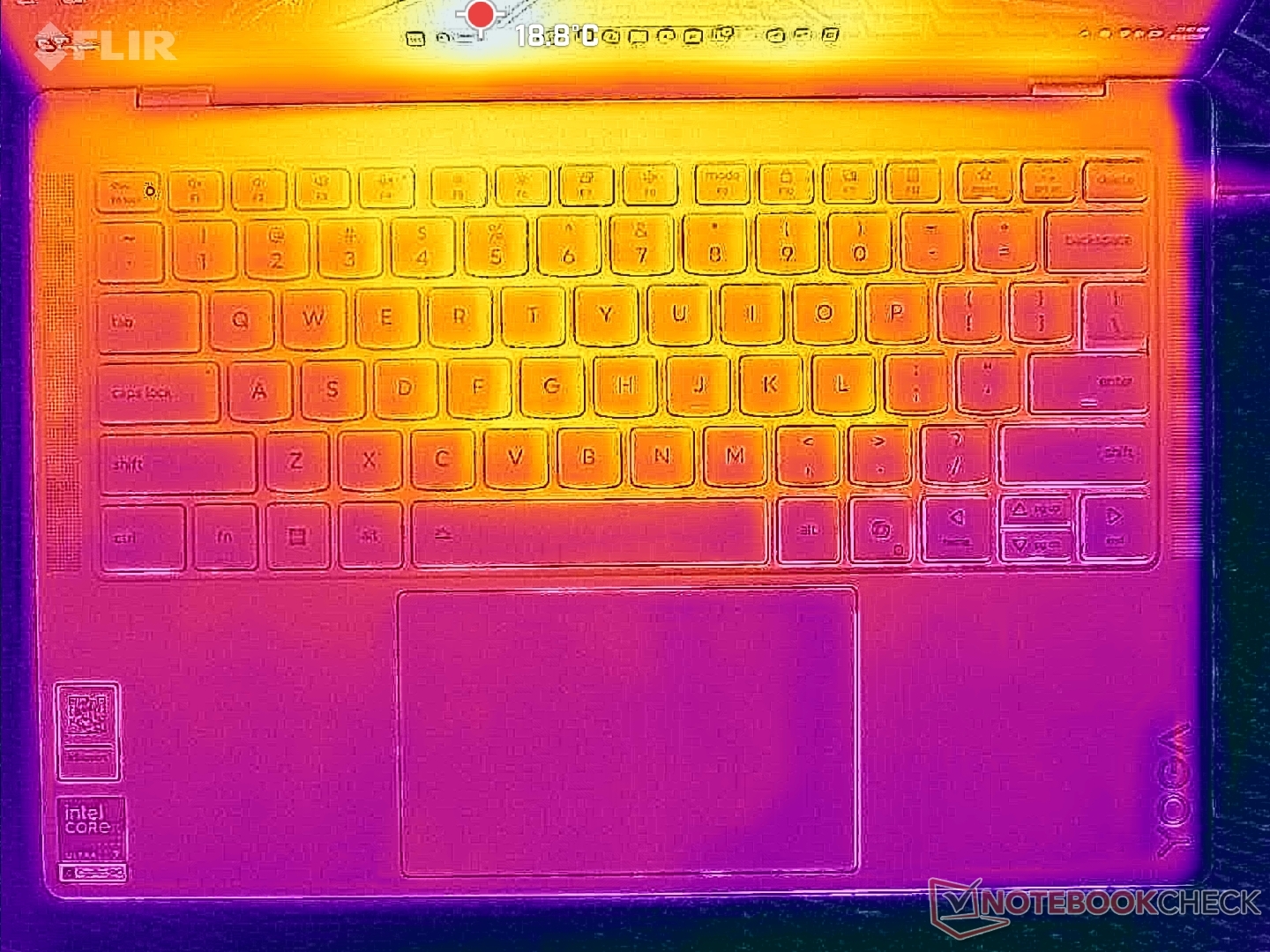 Le temperature di superficie sono relativamente fresche anche quando si eseguono carichi impegnativi. I punti caldi raggiungono un massimo di soli 34 C, rispetto agli oltre 43 C del modello HP OmniBook Ultra 14.