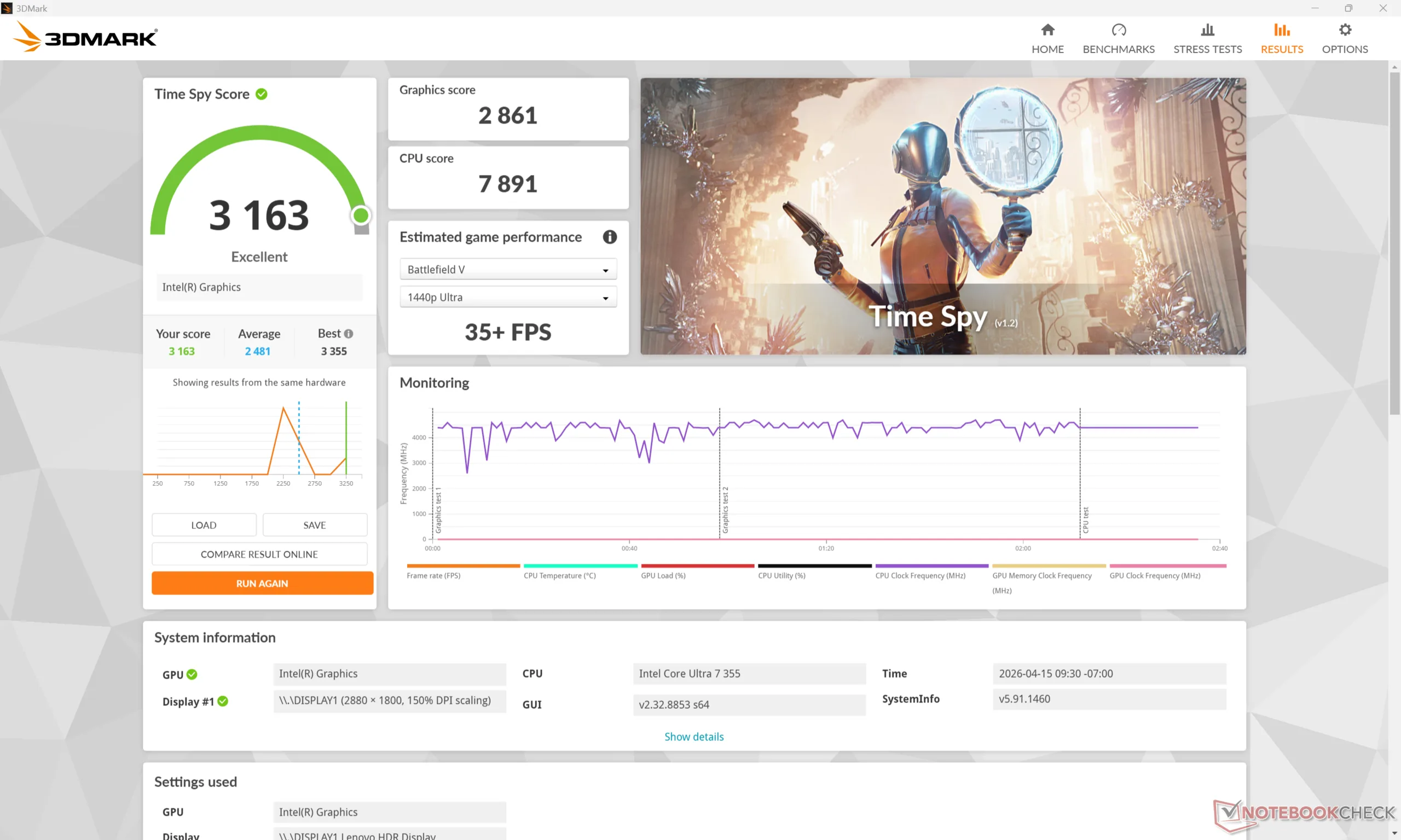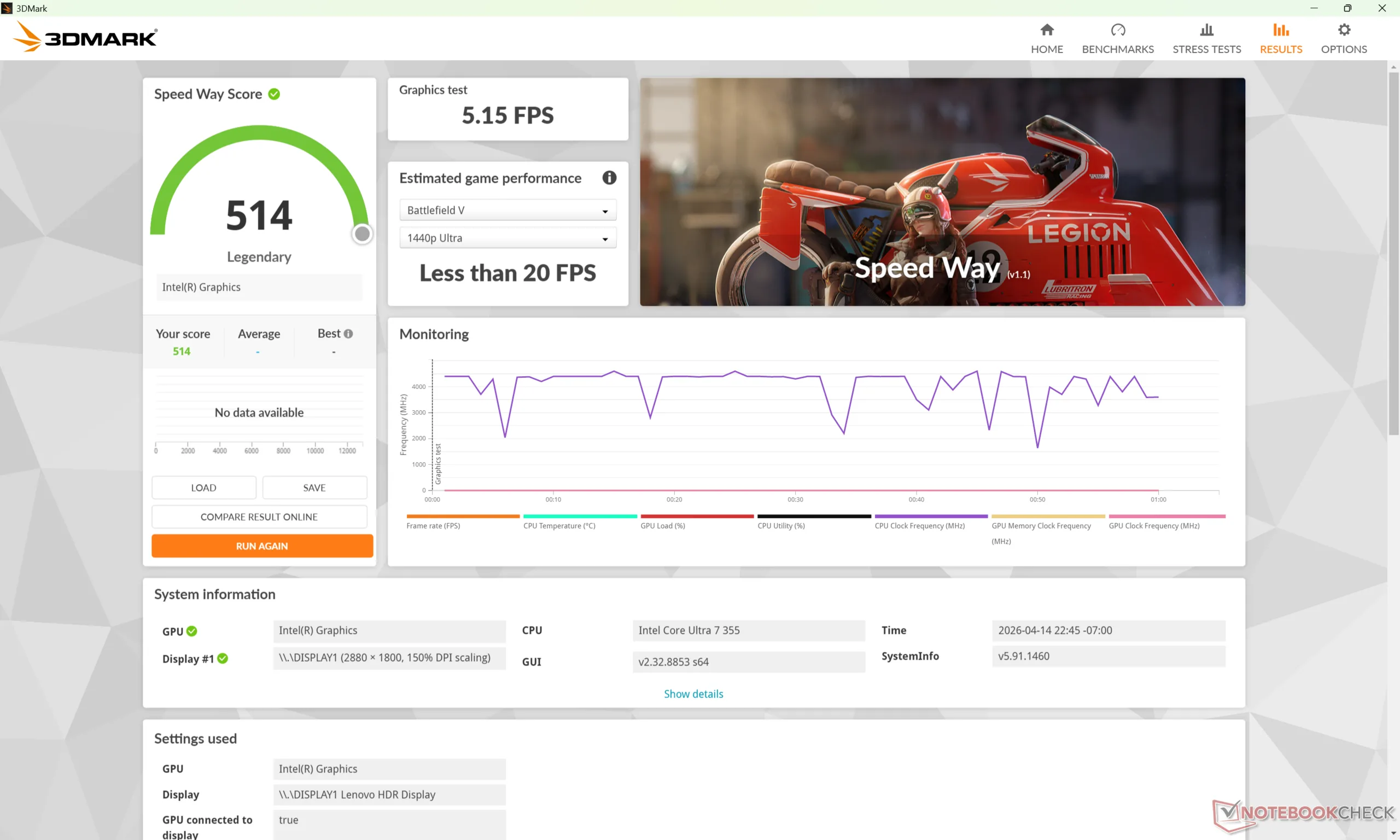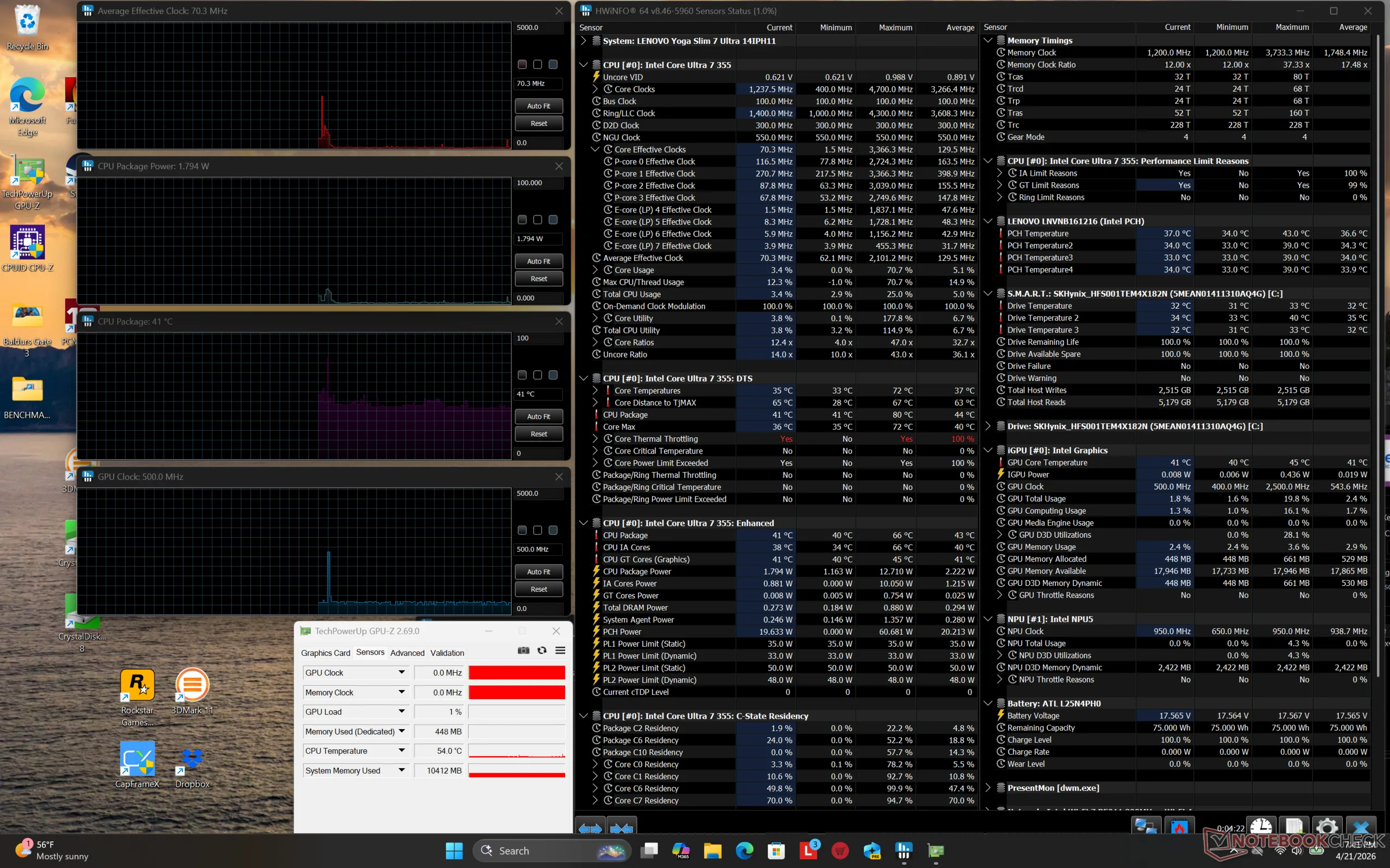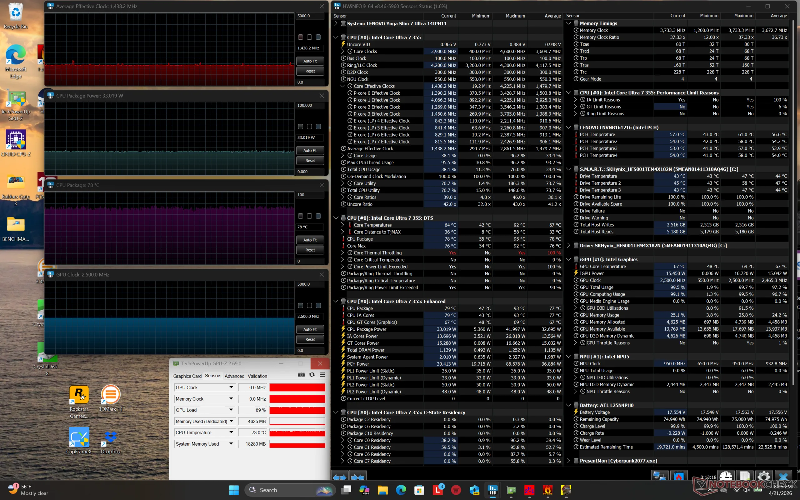 La frequenza di clock della GPU e la temperatura durante l'esecuzione di Cyberpunk 2077 si stabilizzerebbero a 2500 MHz e 78 C, rispettivamente, che è quasi esattamente quello che abbiamo registrato sul concorrente XPS 14 in condizioni simili.