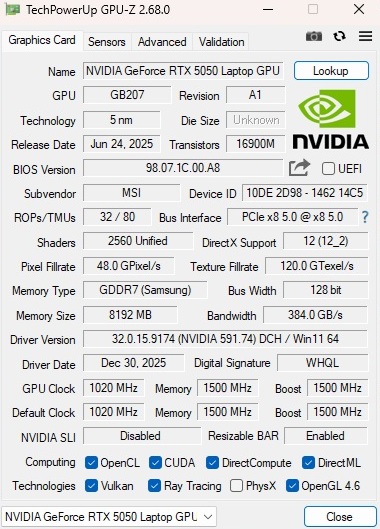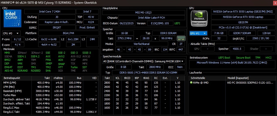 Anche la potenza della scheda grafica merita una discussione: Poiché MSI fornisce alla RTX 5050 solo un misero TGP da 45 watt, le prestazioni della GPU sono inferiori al suo potenziale, come mostreremo nel corso dell'articolo, anche se lo sviluppo del rumore è limitato. Il resto della dotazione è solido, ma non sfarzoso per il prezzo, con un Core 7 240H, 16 GB di RAM DDR5 (2x 8 GB) e un SSD da 512 GB. Nel frattempo, ci sono punti a favore per l'otturatore della privacy della webcam, che non è una cosa scontata per i portatili da gioco in particolare.