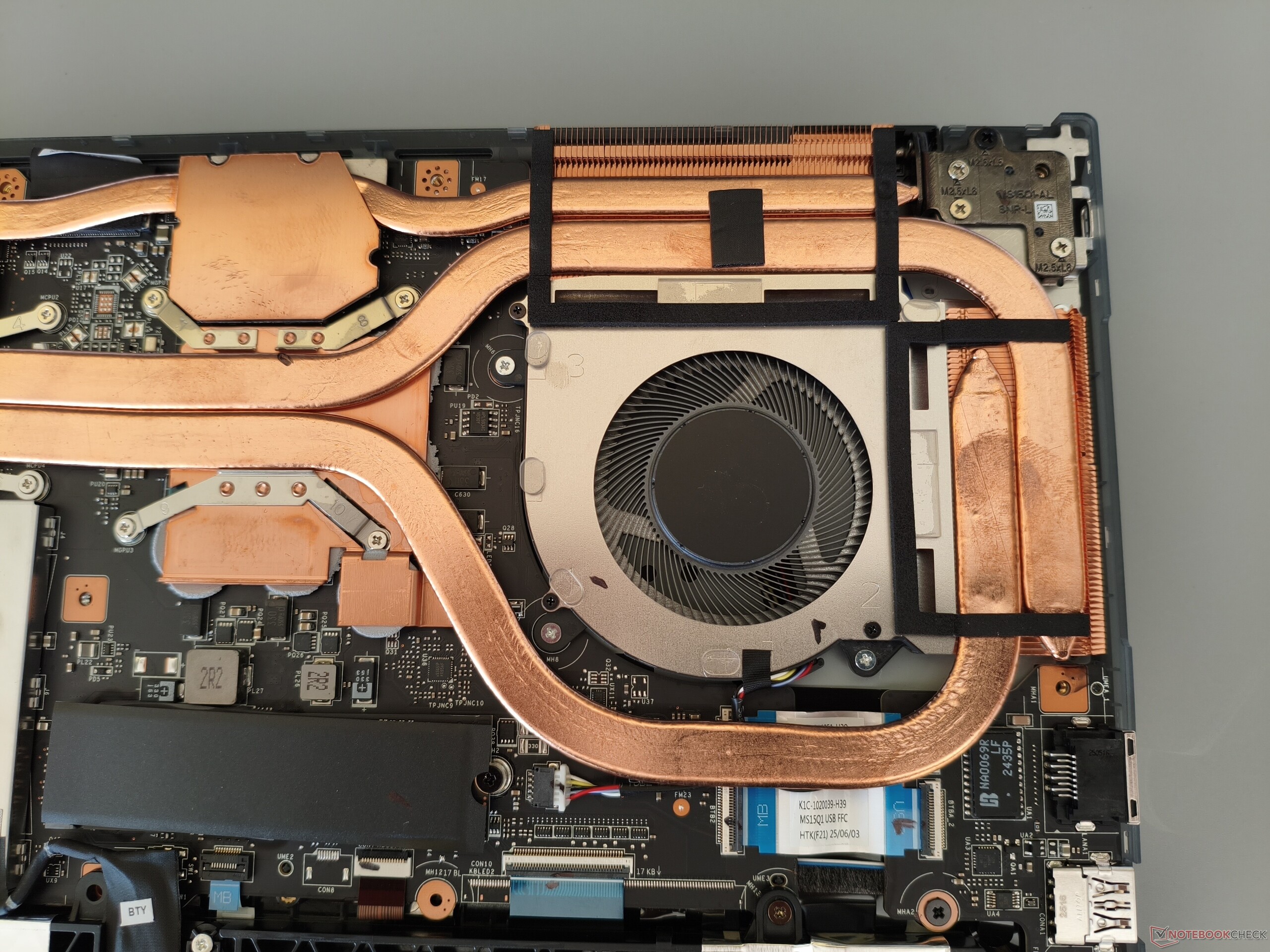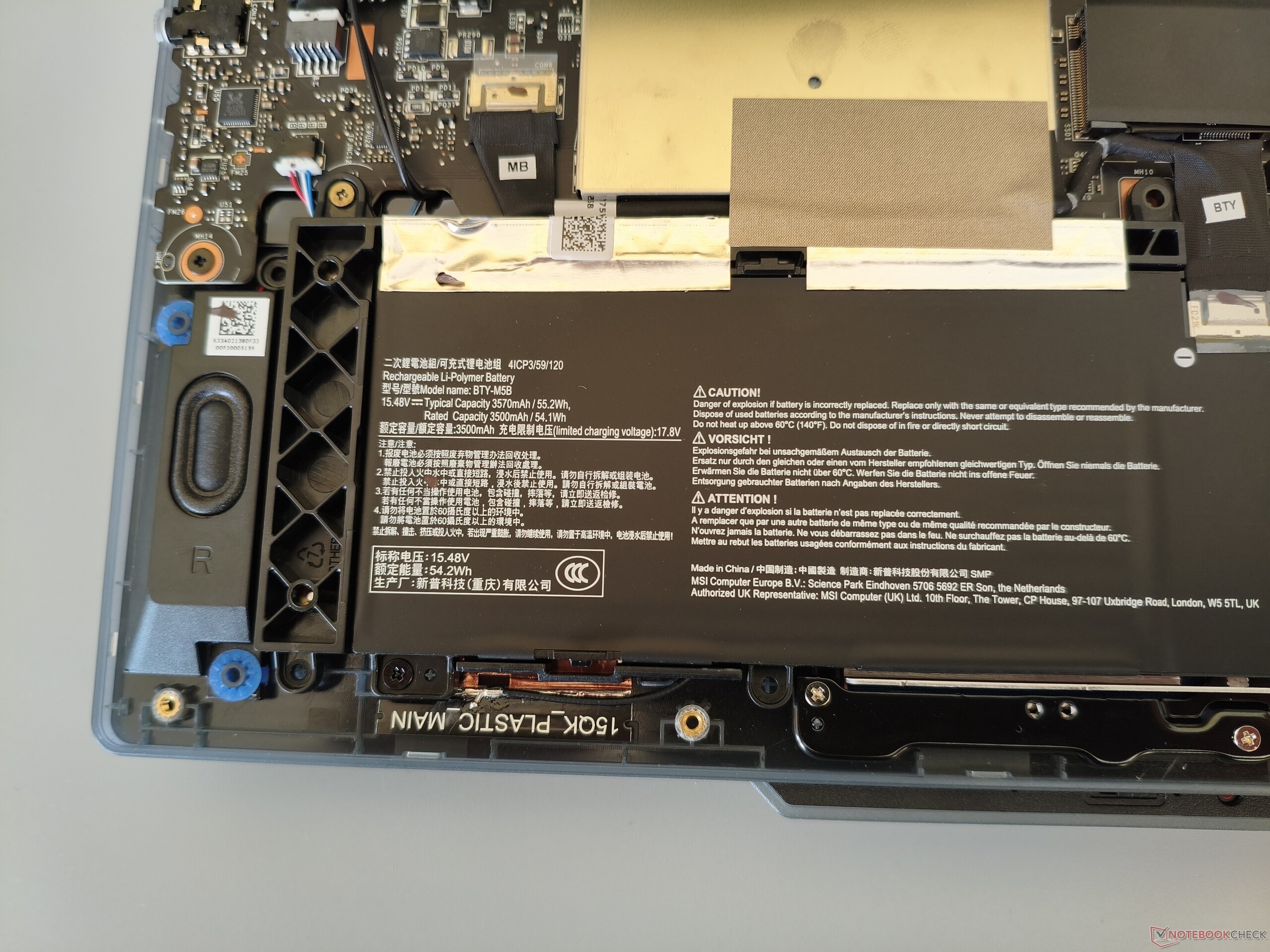 Per l'involucro viene utilizzato un mix di metallo (coperchio) e plastica (unità di base). Per la maggior parte, la lavorazione e la stabilità non danno adito a critiche. MSI merita un elogio particolare per il generoso angolo di apertura di 180°. Con un peso di poco inferiore a 2,2 kg (~4,9 libbre), il Cyborg 15 si colloca comodamente nel mezzo della concorrenza, che pesa tra 1,9 e 2,4 kg (~4,2 e 5,3 libbre). Per aprire il case, è necessario rimuovere 12 viti Phillips. Può scoprire come si presenta sotto il cofano nelle immagini qui sotto.