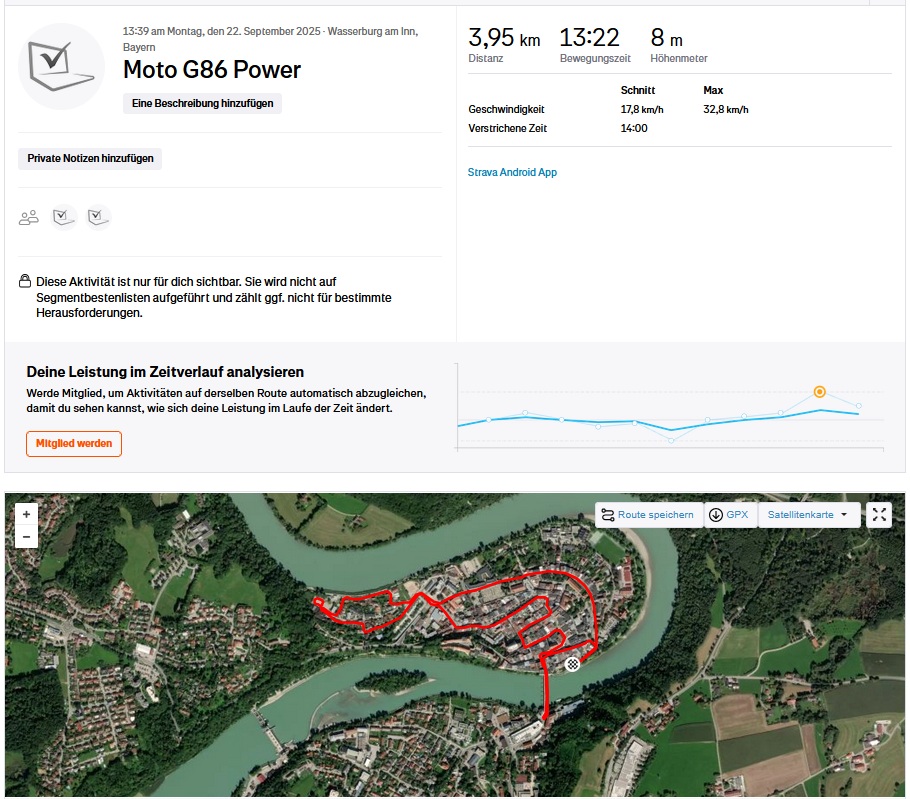 All'aperto, il Moto G86 Power fissa rapidamente la sua posizione entro circa tre metri. Durante il nostro test in bicicletta, l'accuratezza della posizione era occasionalmente un po' fuori luogo, ma lo smartphone è comunque abbastanza preciso per la navigazione di tutti i giorni.