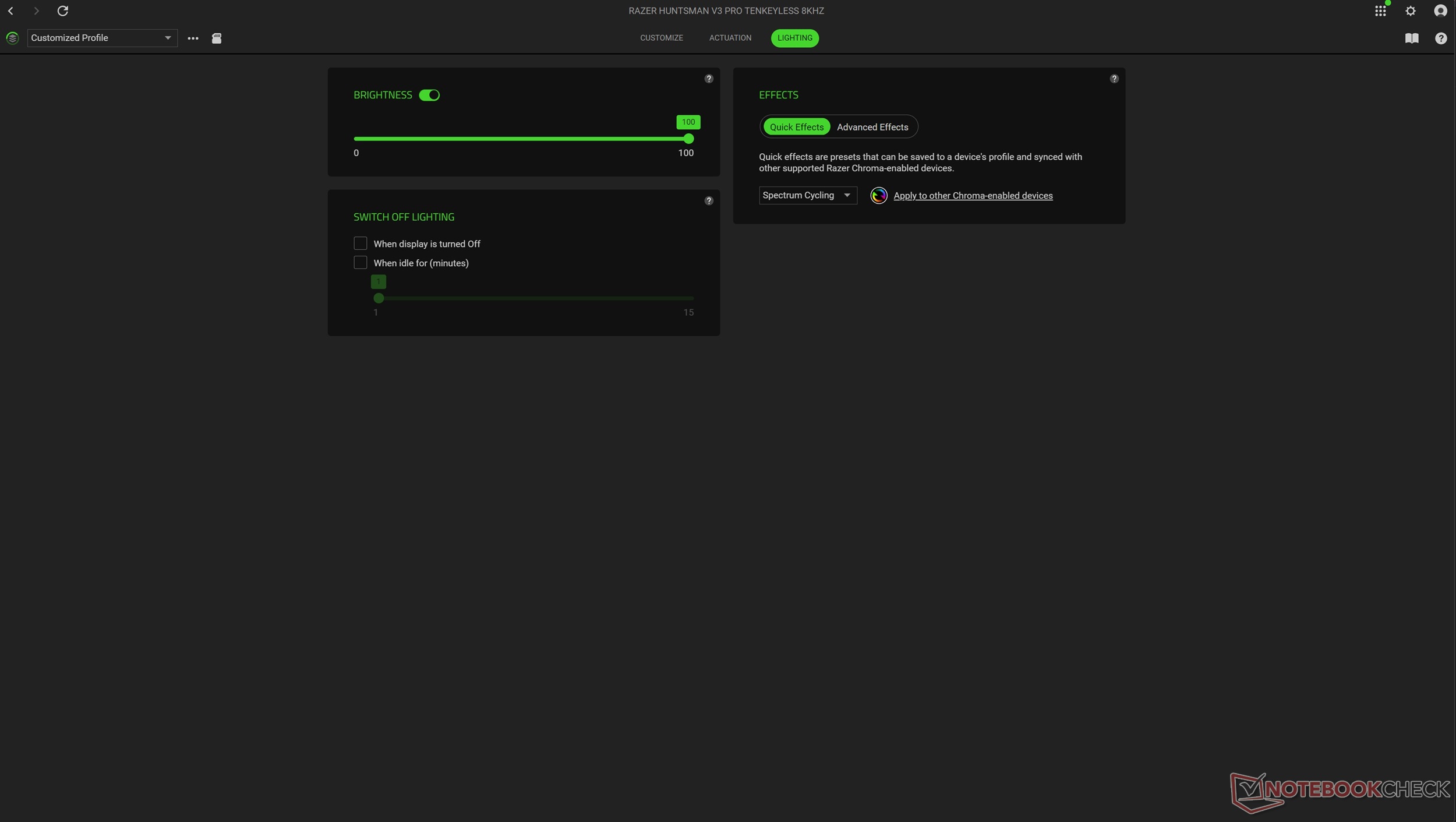L'Huntsman aggiornato è ricco di funzioni, il che può rendere la navigazione nei menu di Synapse intimidatoria. Tuttavia, Razer è riuscito a dividere l'applicazione in tre schede: Personalizzazione, Azionamento e Illuminazione. La personalizzazione consente ai giocatori di regolare la frequenza di polling o di attivare e disattivare opzioni come la Modalità Gioco.