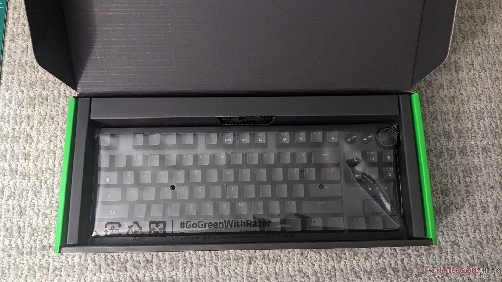 L'ultima tastiera Razer viene consegnata in una scatola rettangolare nera e verde. All'interno, gli acquirenti troveranno un cavo intrecciato staccabile da USB Tipo A a Tipo C, un poggiapolsi magnetico in similpelle e una guida rapida.