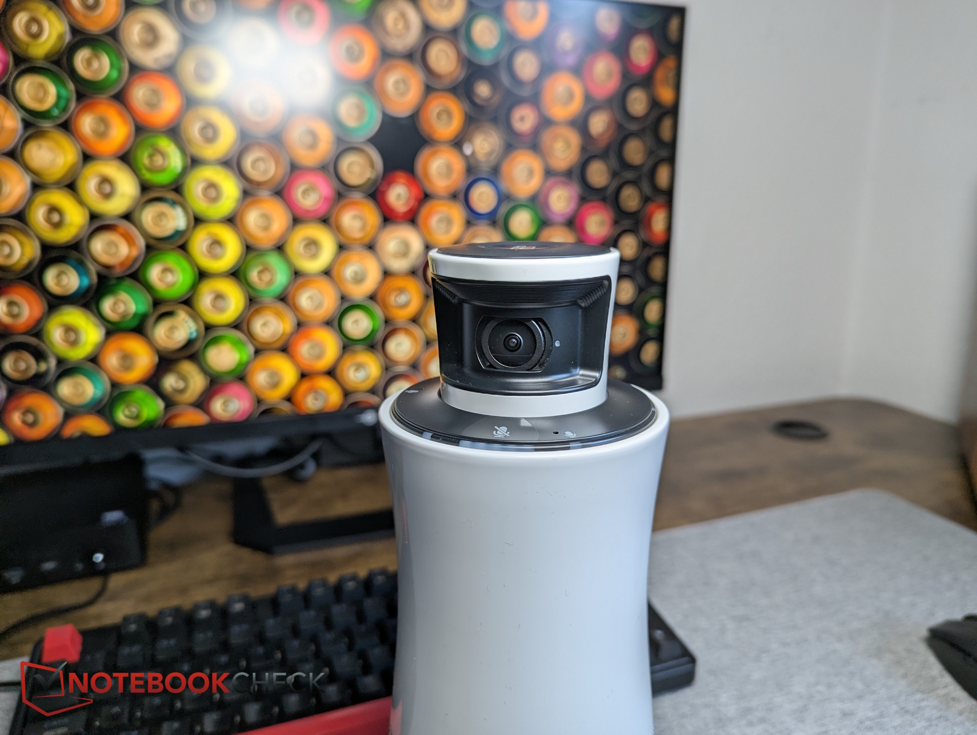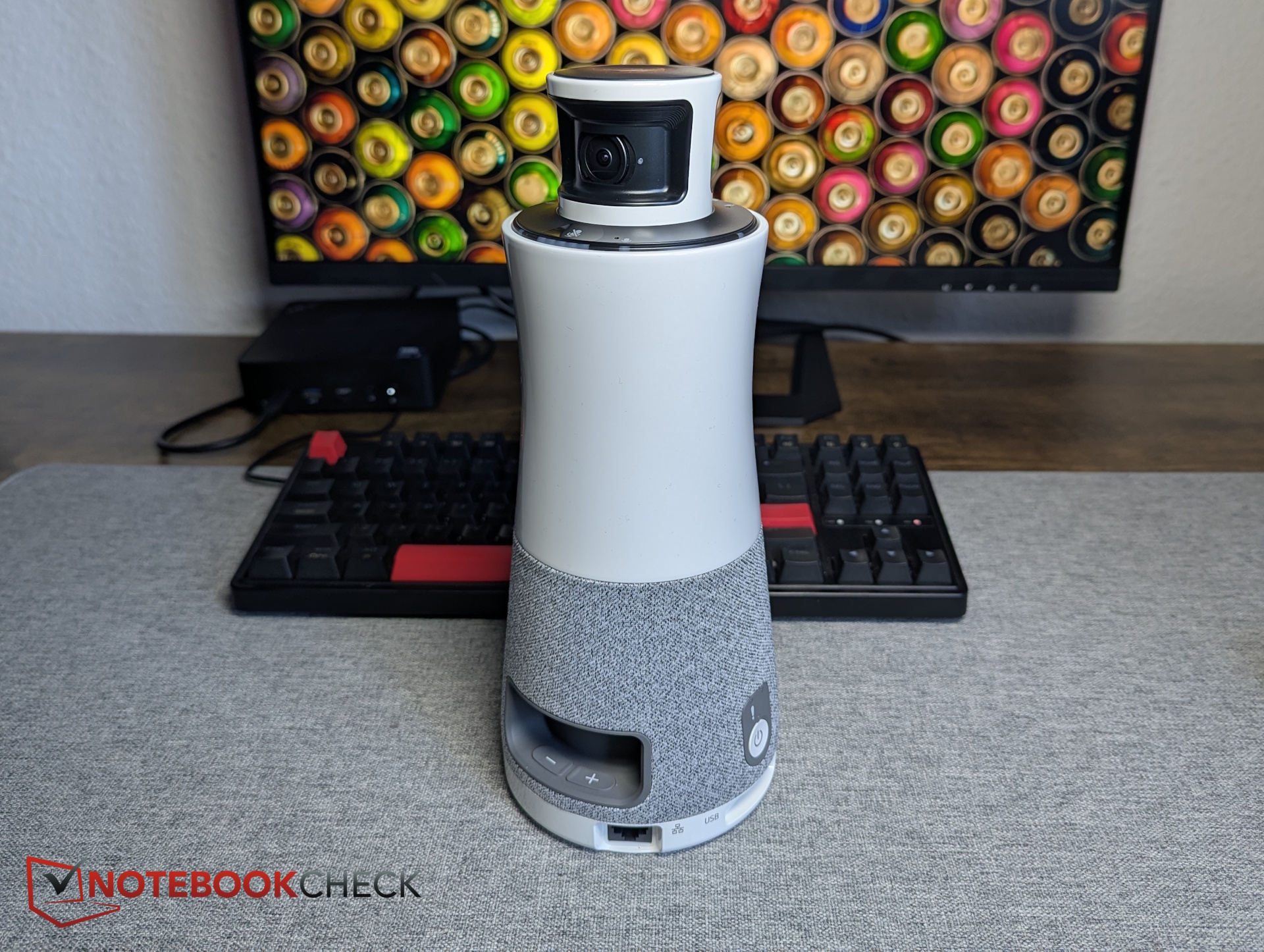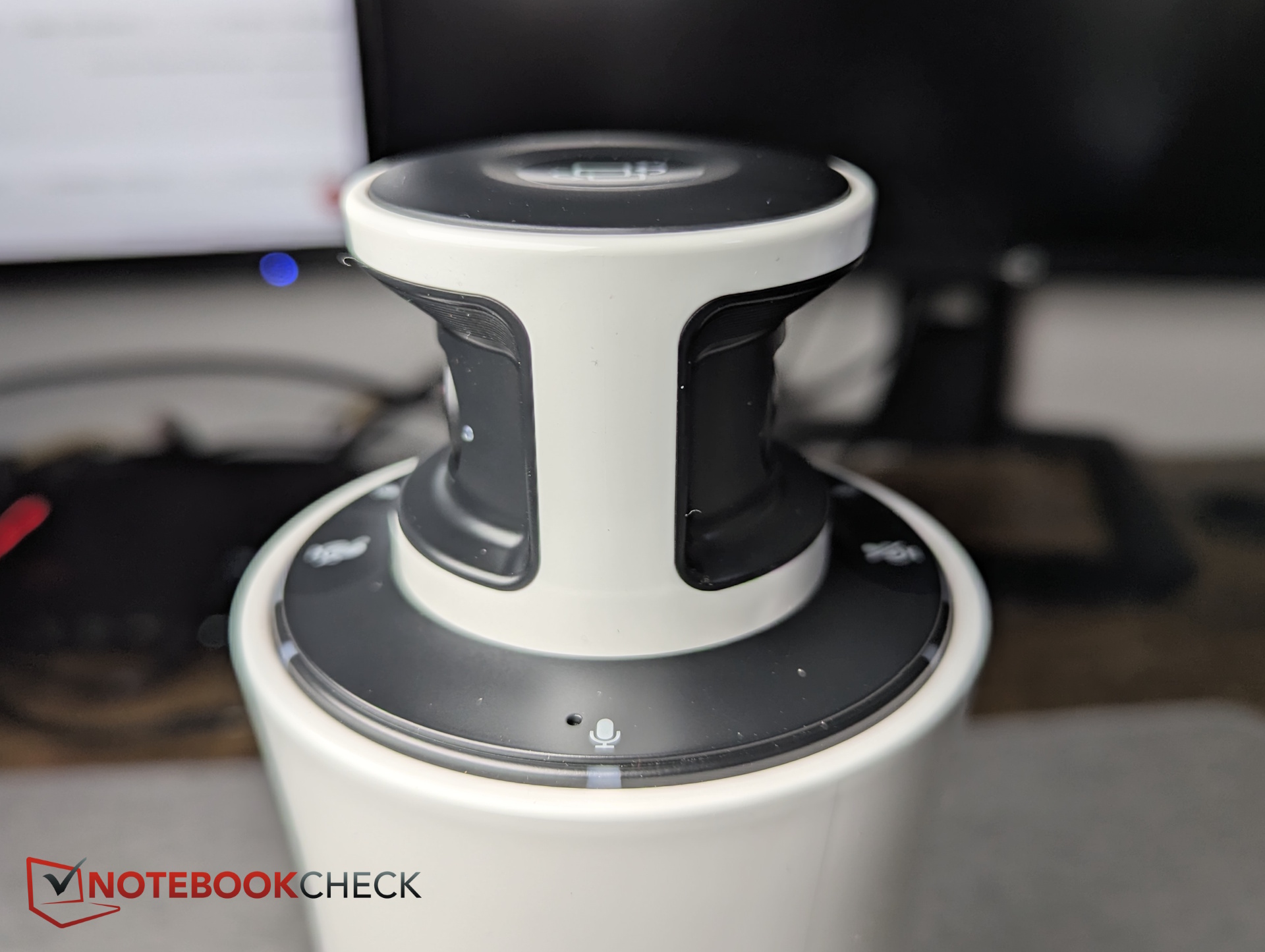 L'alloggiamento in plastica a forma di colonna colloca le due telecamere a 180 gradi nella parte superiore. Questo ha senso, in quanto le telecamere si trovano al di sopra dei display dei computer portatili e di altri ostacoli, posizionandole vicino all'altezza degli occhi senza bloccare la linea visiva dei partecipanti tra loro. Anche i tre microfoni si trovano in alto.