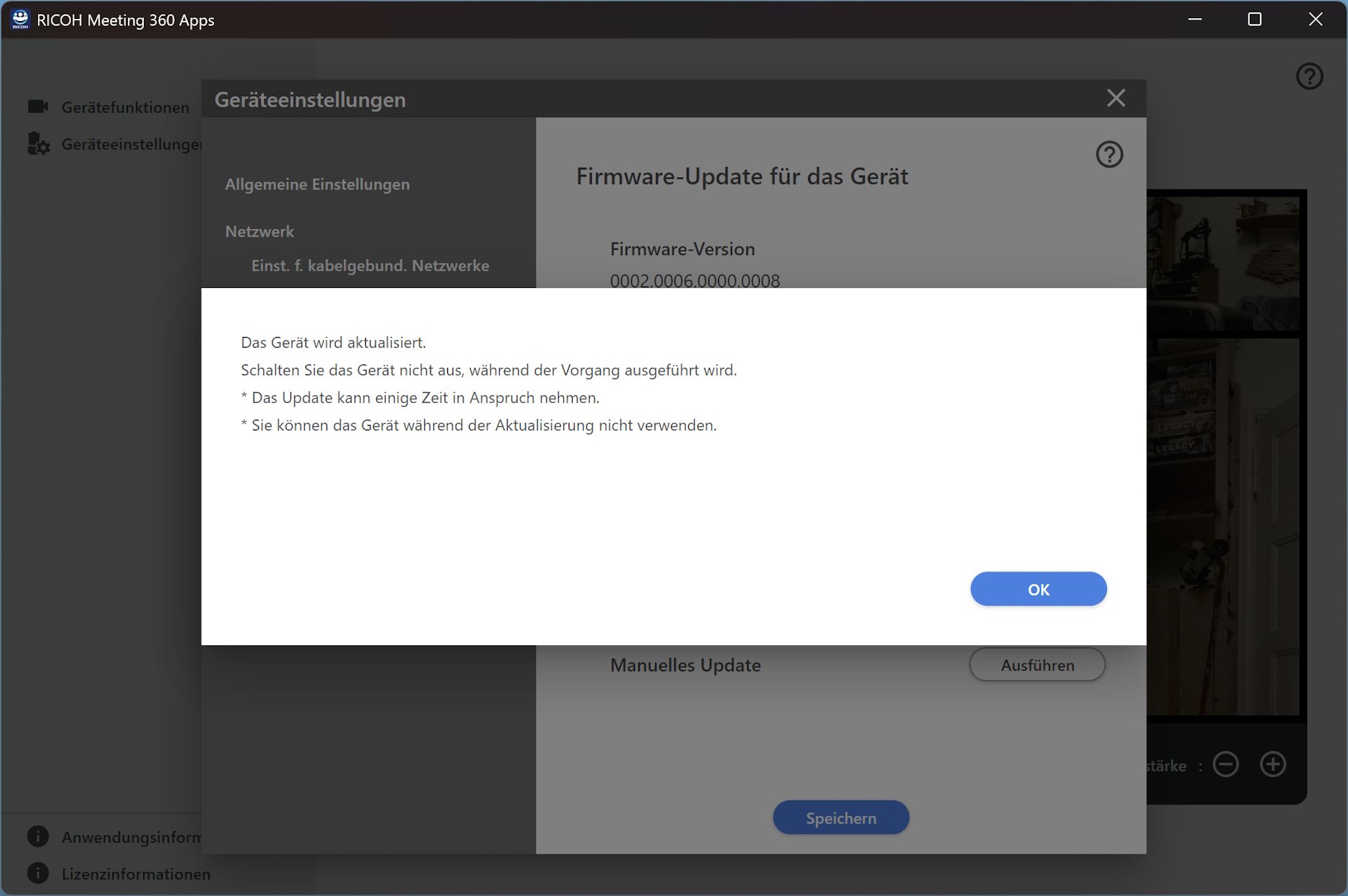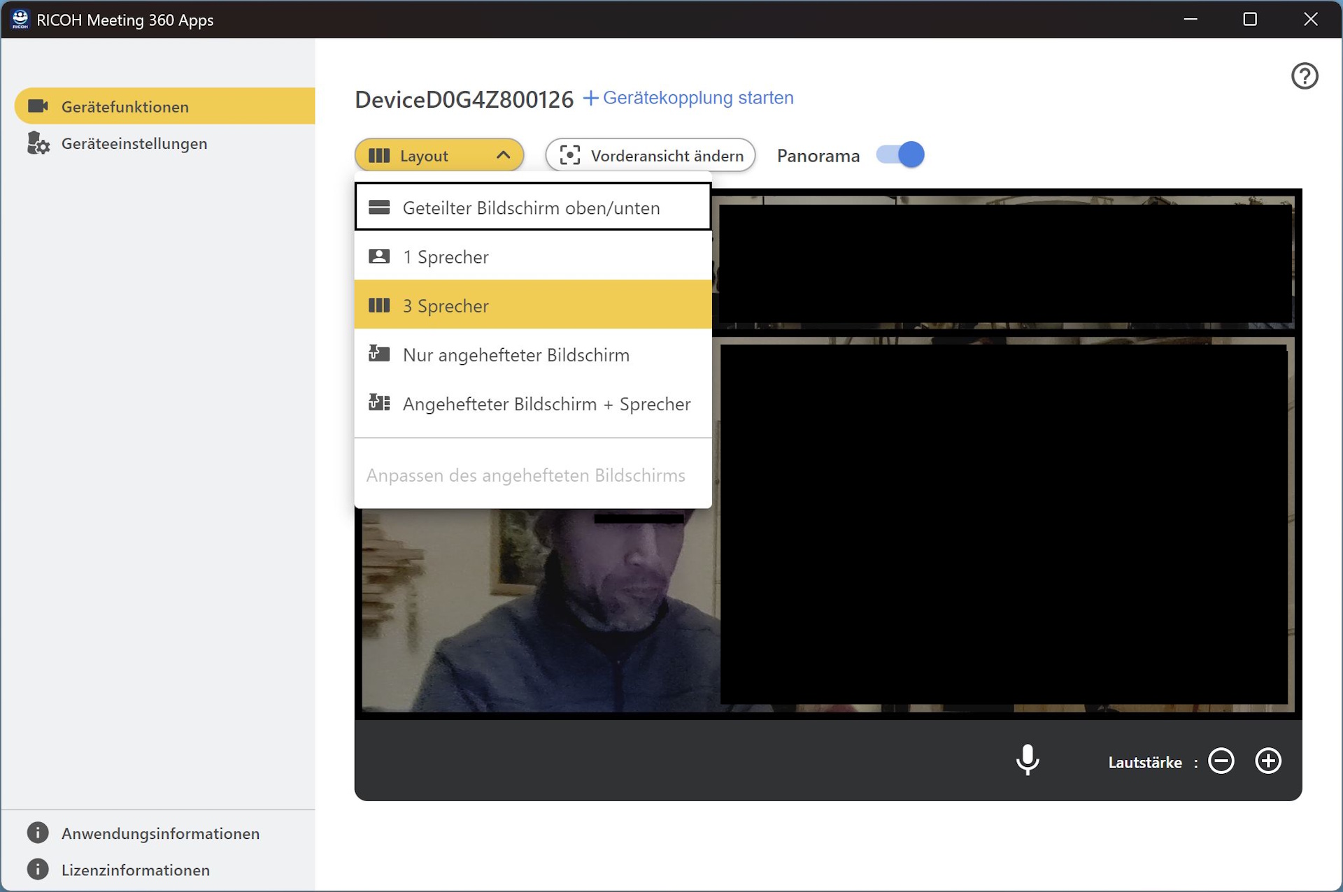 Ricoh offre anche l'applicazione Ricoh Meeting 360. Da qui, gli utenti possono avviare gli aggiornamenti del firmware (il dispositivo deve essere prima collegato via LAN), configurare le preferenze di layout e regolare altre impostazioni.