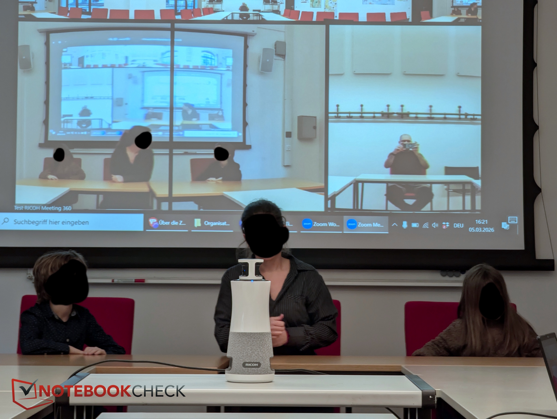In una videoconferenza, l'hub plug-and-play Ricoh Meeting 360 cattura in modo affidabile l'oratore attivo e ogni altro partecipante nella stanza, grazie al suo campo visivo panoramico. La qualità dell'immagine e dell'audio (tramite Zoom, Teams, ecc.) è convincente a distanze tipiche e in buone condizioni di illuminazione. Il sistema funziona meglio nelle sale conferenze di piccole e medie dimensioni.