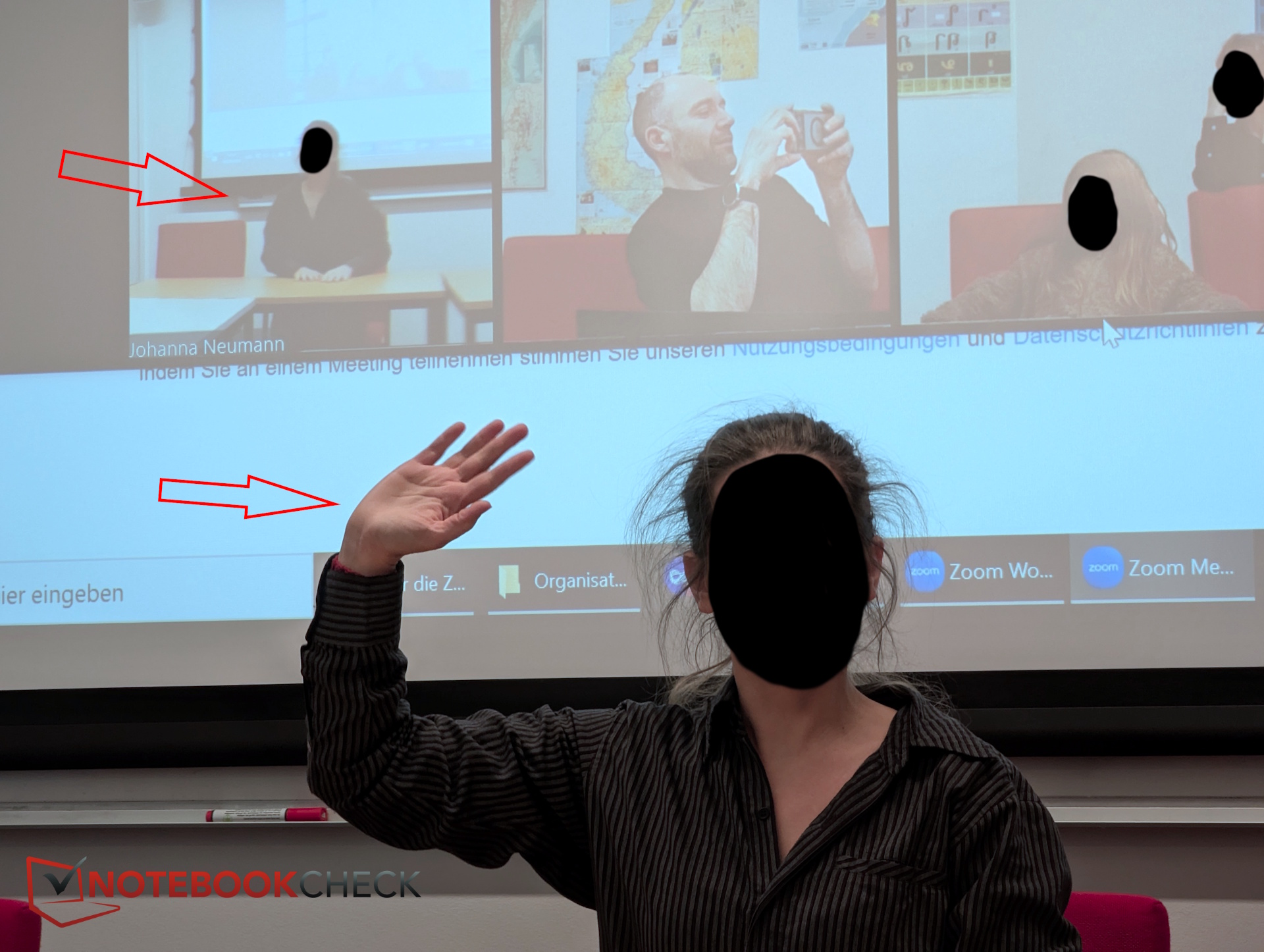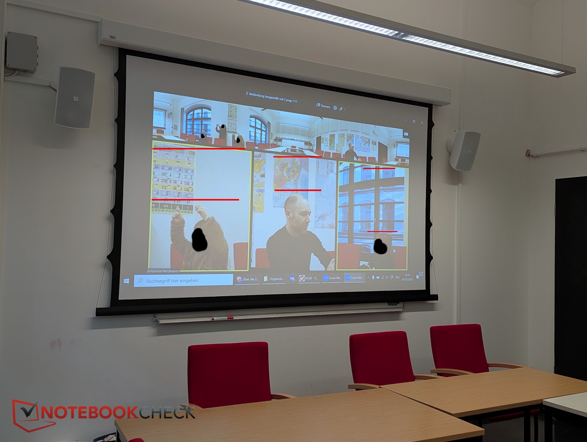 Per ulteriori test, abbiamo visitato l'Università Humboldt di Berlino e abbiamo valutato l'hub di conferenza in una sala seminari con diversi partecipanti seduti in posizioni diverse. Un altro partecipante si è unito tramite una videochiamata Zoom.