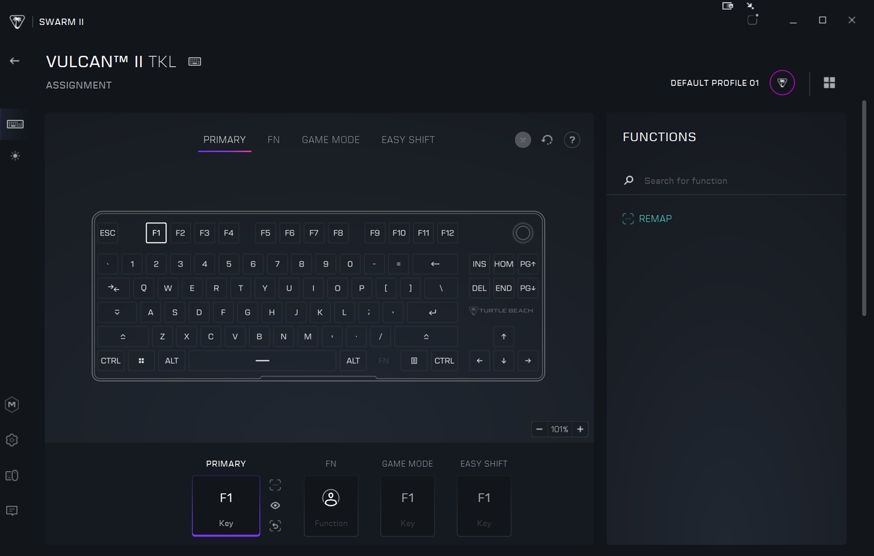 Il software Swarm II cerca di unificare le apparecchiature più vecchie Apparecchiature dell'era Roccat con i prodotti Turtle Beach più recenti. La transizione non è stata sempre fluida e inizialmente si sono verificati alcuni problemi di comunicazione tra l'applicazione e la tastiera. Una reinstallazione ha risolto il problema e nelle settimane successive ha modificato le impostazioni in modo affidabile.