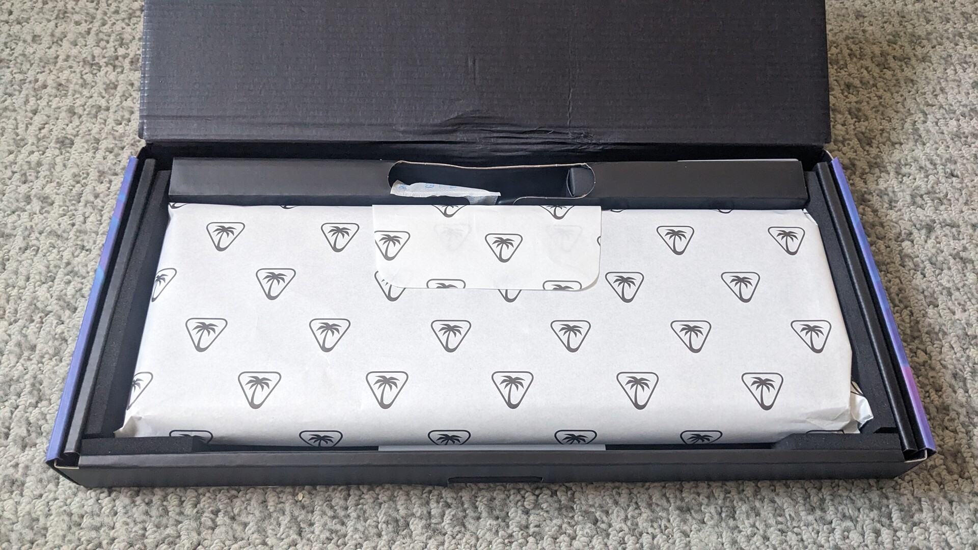 L'ultima tastiera da gioco di Turtle Beach viene spedita in una scatola rettangolare viola, con la periferica avvolta in carta velina all'interno. Gli acquirenti ricevono anche un estrattore di interruttori, un cavo USB-C staccabile da 1,8 metri e tre interruttori lineari Titan HS di ricambio.