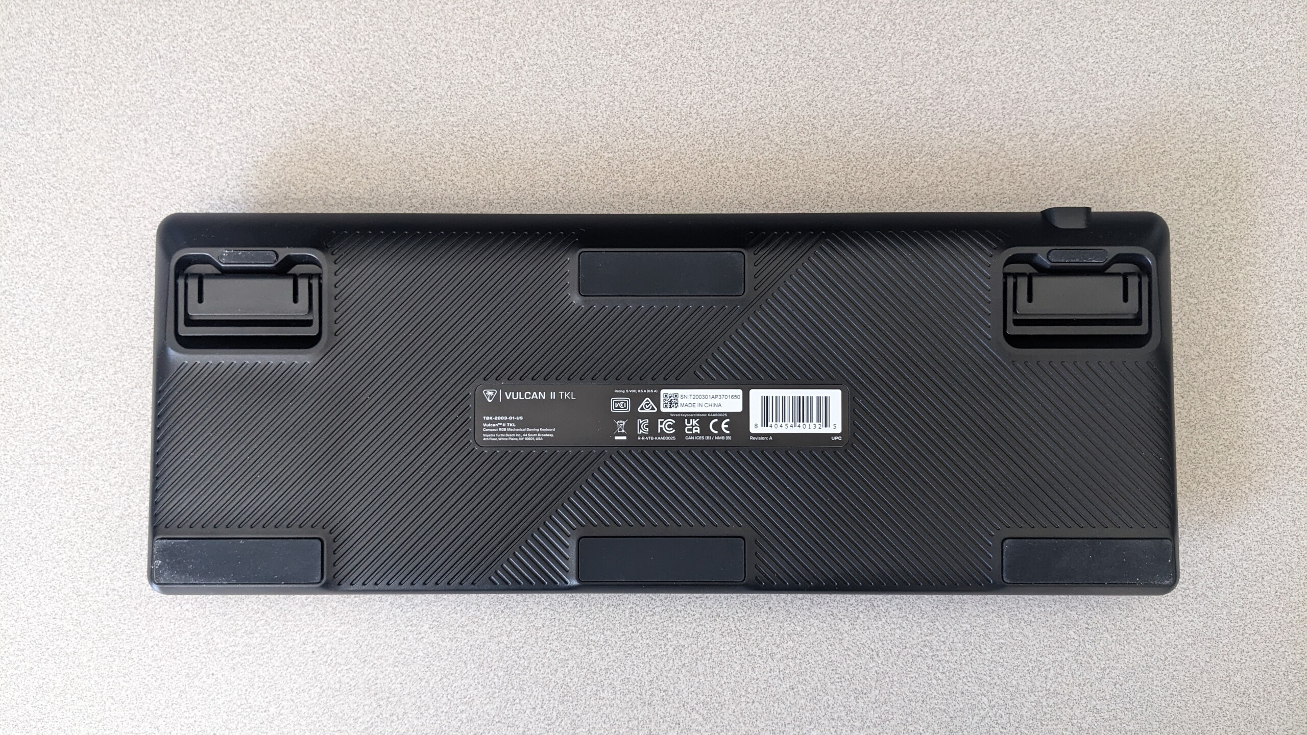 Vulcan II TKL condivide diverse caratteristiche di una tastiera tastiera a basso profilo. Il suo involucro è spesso solo 32 mm/1,27 pollici, anche se i sottili copritasti si ergono ben al di sopra della sua superficie. Le pedane regolabili sottostanti offrono una maggiore flessibilità ergonomica.