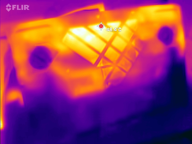 Il forte sistema di raffreddamento mantiene le temperature generalmente basse. Sotto carico, si misurano punti caldi di circa 45°C al centro della parte inferiore, mentre altre aree rimangono significativamente più fredde.