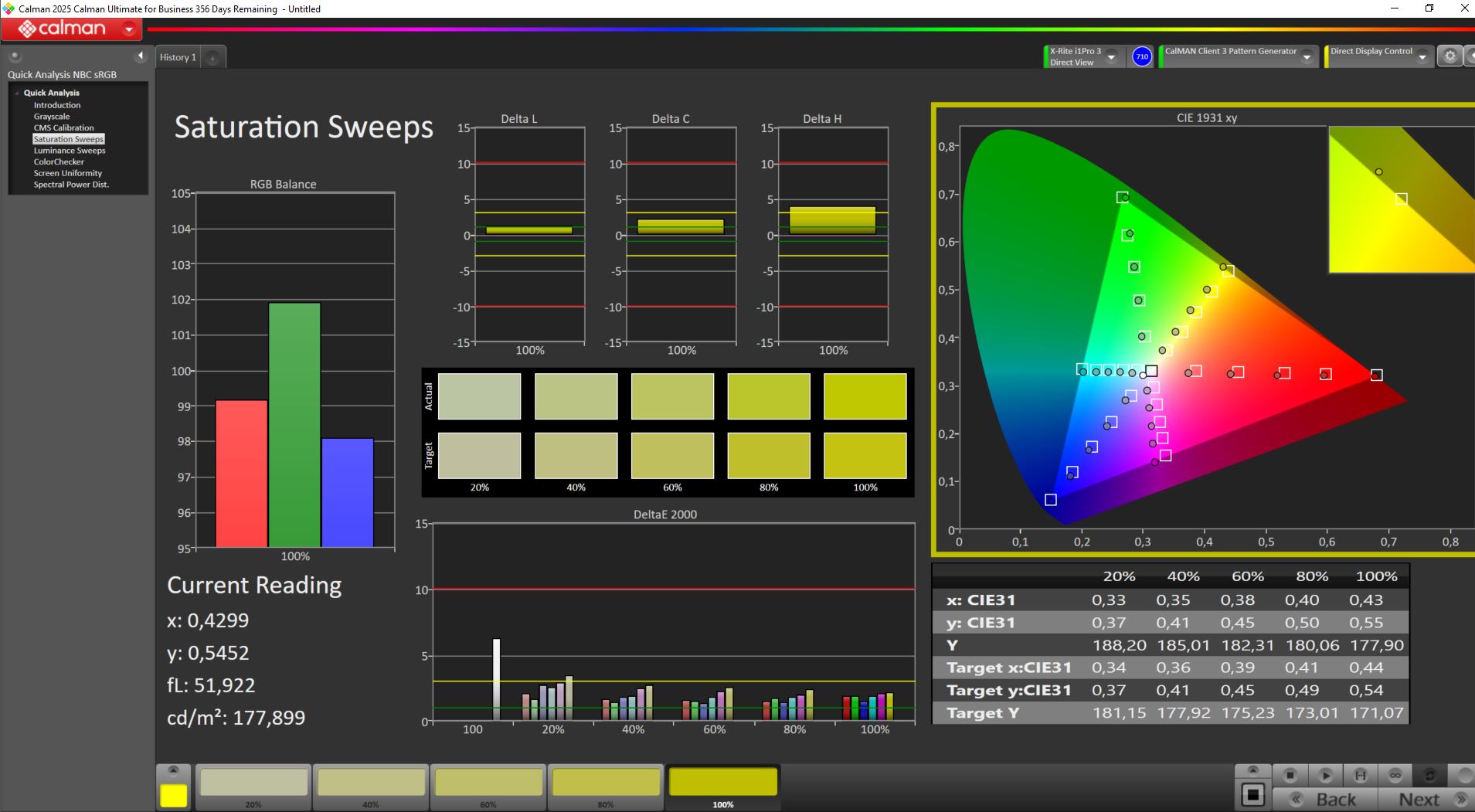 Fuori dalla scatola, la calibrazione è scarsa, con deviazioni DeltaE elevate. Dopo la ricalibrazione manuale, abbiamo ridotto le deviazioni della scala di grigi e del colore a meno di 1 - risultati eccellenti. Il nostro profilo ICC calibrato è disponibile per il download qui sopra.