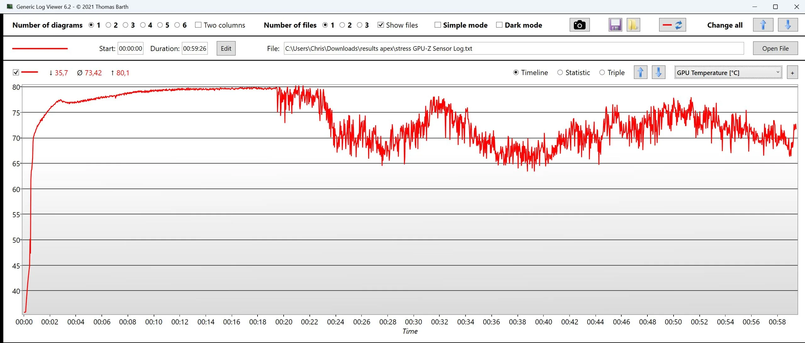 | Clock della CPU (GHz) | Clock della GPU (MHz) | Temperatura media della CPU (°C) | Temperatura media della GPU (°C) | |