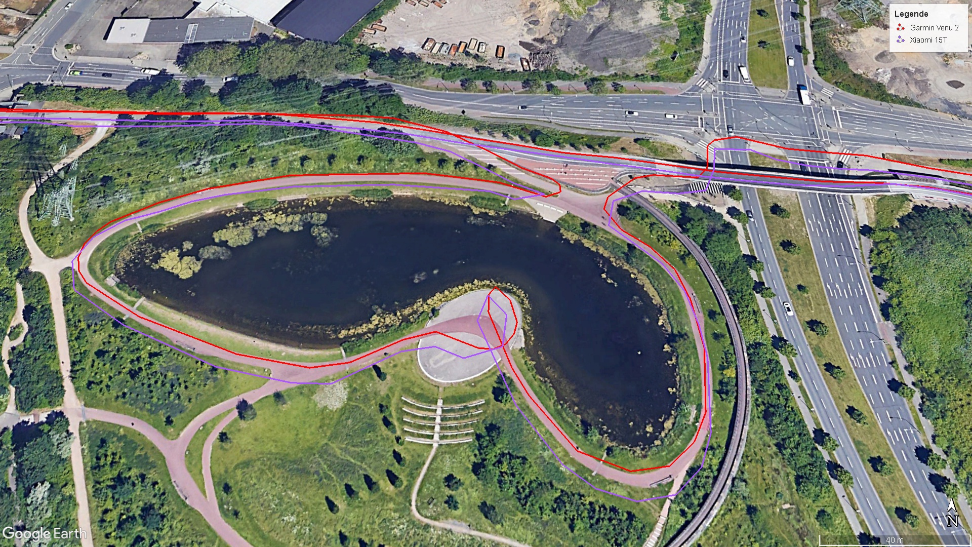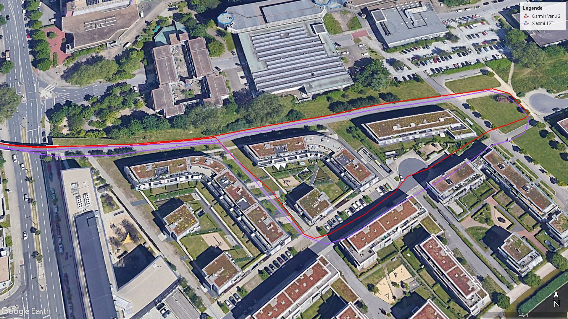 Il telefono Xiaomi esegue rapidamente un Satfix all'aperto con un'elevata precisione di 1 metro. Nel nostro test pratico, confrontiamo lo Xiaomi 15T con uno smartwatch Garmin (Venu 2). Entrambi presentano alcune imprecisioni, ma il posizionamento del telefono di fascia media è più che sufficiente per le attività di navigazione.