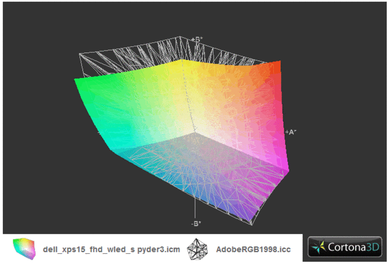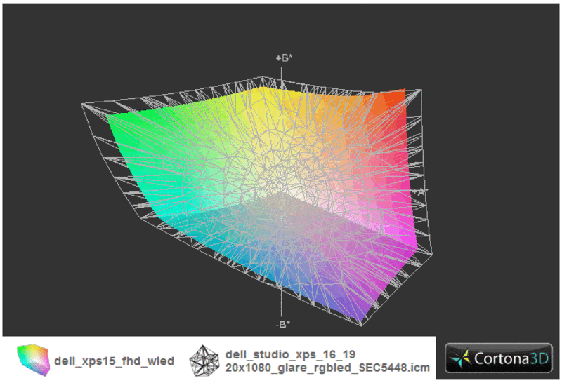 Il nostro modello monta lo schermo full HD B+RG LED. Dopo averlo calibrato e testato il profilo ICC abbiamo rilevato che lo schermo mostra una gamma di colori molto ampia. sRGB ed AdobeRGB sono entrambi coperti in buona parte. In termini di colori, il nostro portatile si attesta appena dietro l'XPS 16 con display LED RGB.