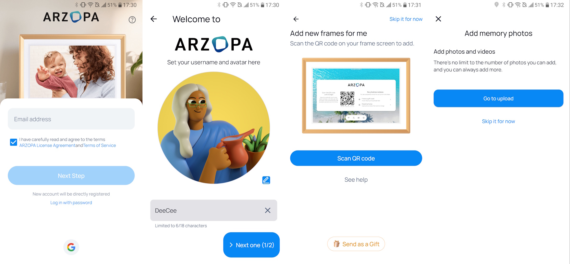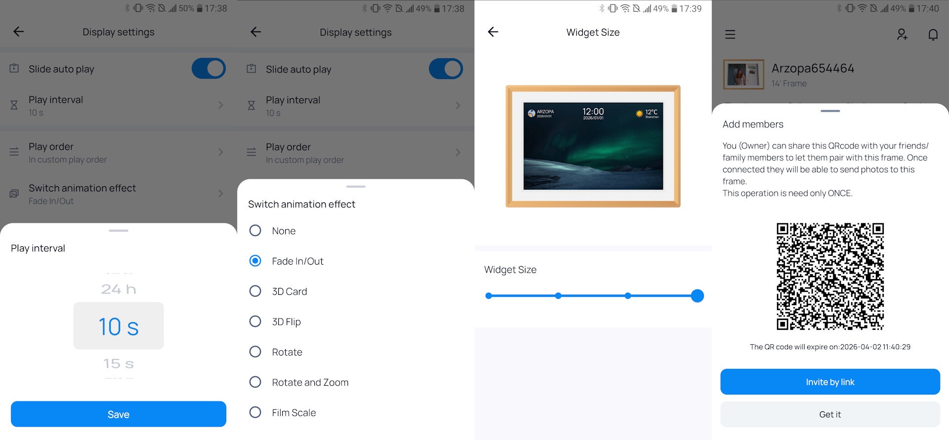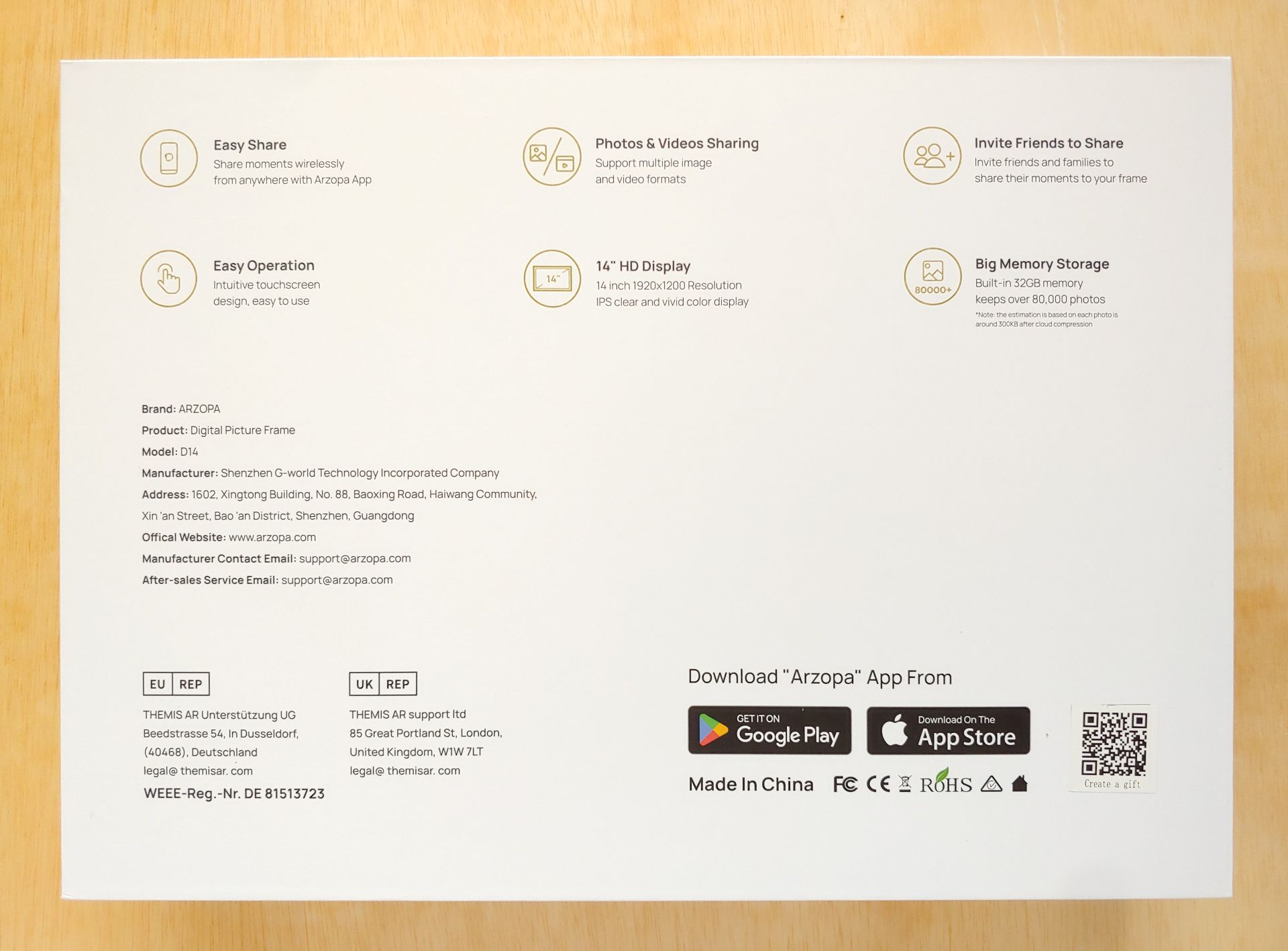Il software è facile da installare e l'aggiunta di una foto richiede solo pochi secondi. L'accesso alla cornice Arzopa può essere condiviso con amici e familiari, consentendo a tutti di caricare le foto in remoto attraverso l'app. L'app consente inoltre agli acquirenti di precaricare una benedizione e una foto prima del regalo, e i proprietari possono aggiungere codici regalo per importare ulteriori foto di eventi.