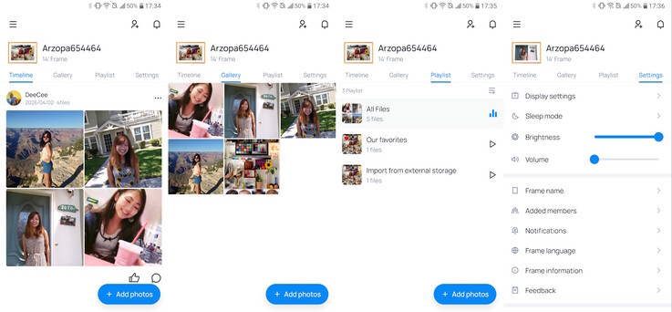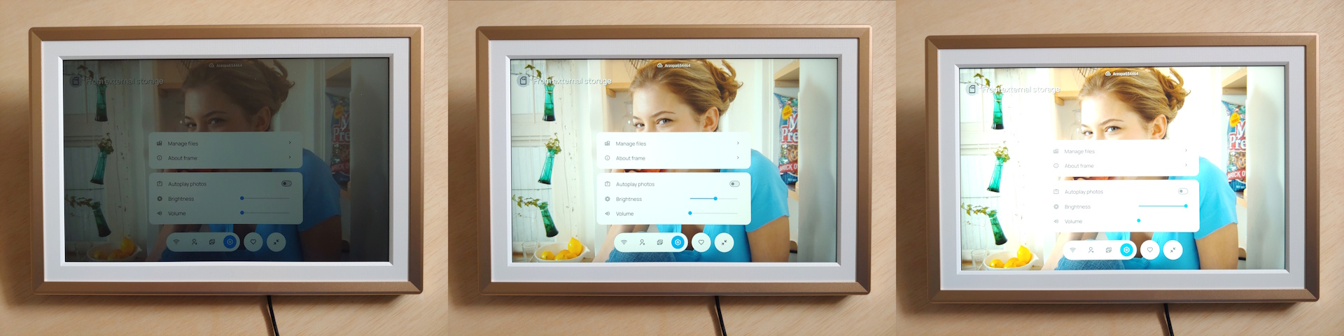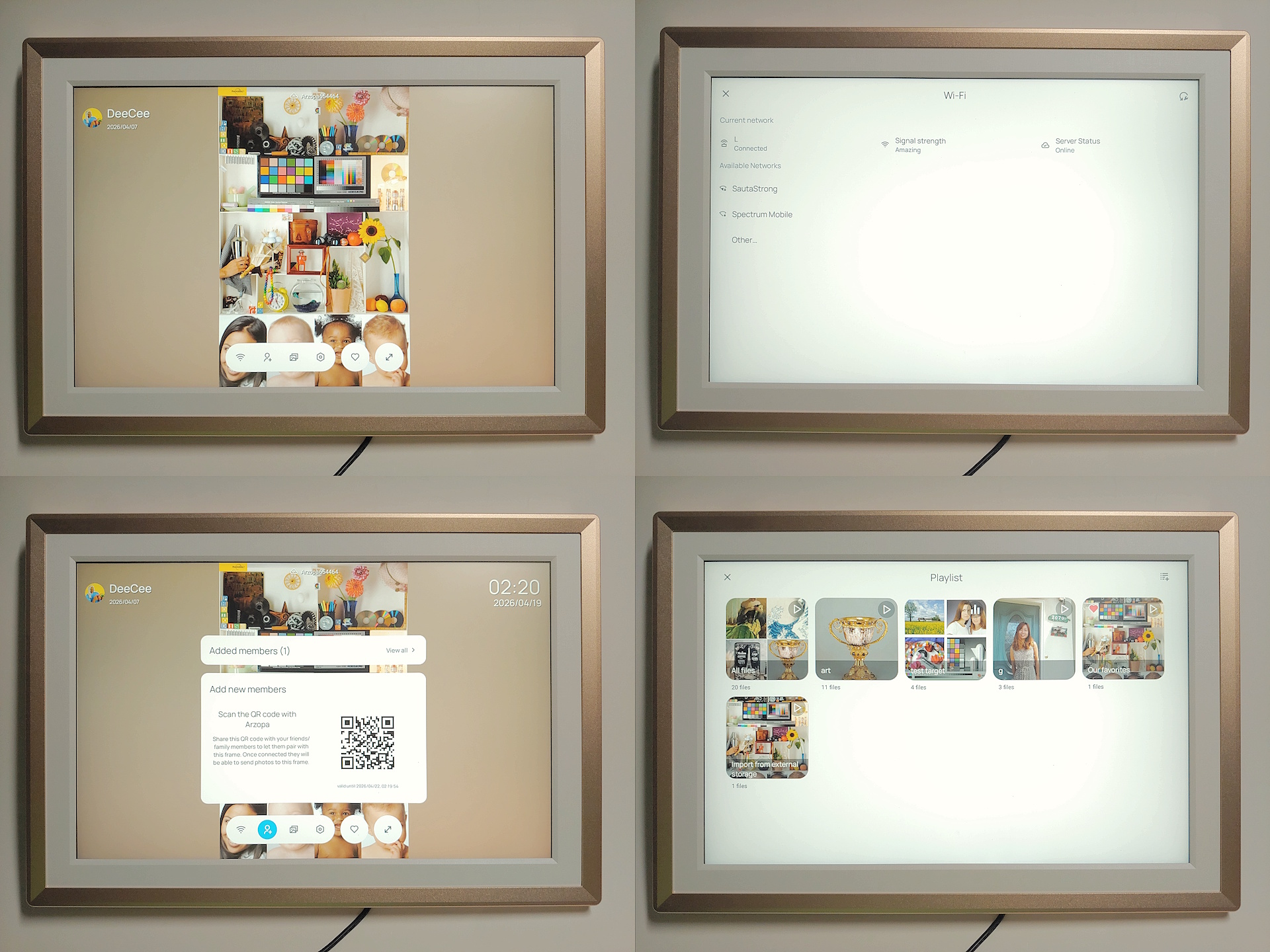 Le impostazioni Wi-Fi rendono facile l'aggiunta di una nuova connessione, anche se le reti proxy non sono supportate. Le impostazioni utente consentono di aggiungere rapidamente nuovi membri che possono caricare foto in remoto. Il menu Foto consente agli utenti di riprodurre i media da una scheda SD, trasferire i file tramite USB, eliminare gli elementi o reimpostare la cornice, con cartelle disponibili per organizzare librerie di grandi dimensioni. Le impostazioni di sistema controllano la luminosità, il volume, la riproduzione automatica delle foto e la gestione dei file.