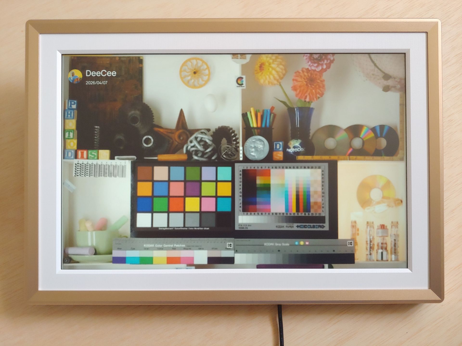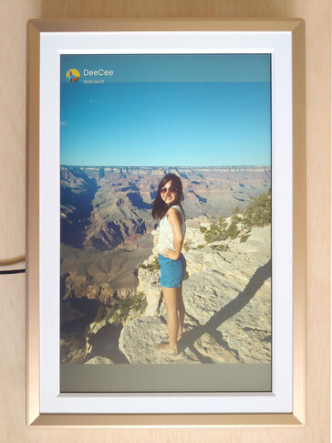La cornice include 32 GB di memoria interna e un'archiviazione cloud illimitata. Gli utenti possono aggiungere didascalie opzionali e ritagliare le foto per l'orientamento orizzontale o verticale, anche se le modifiche avanzate richiedono applicazioni esterne. Sono supportati anche brevi video clip.