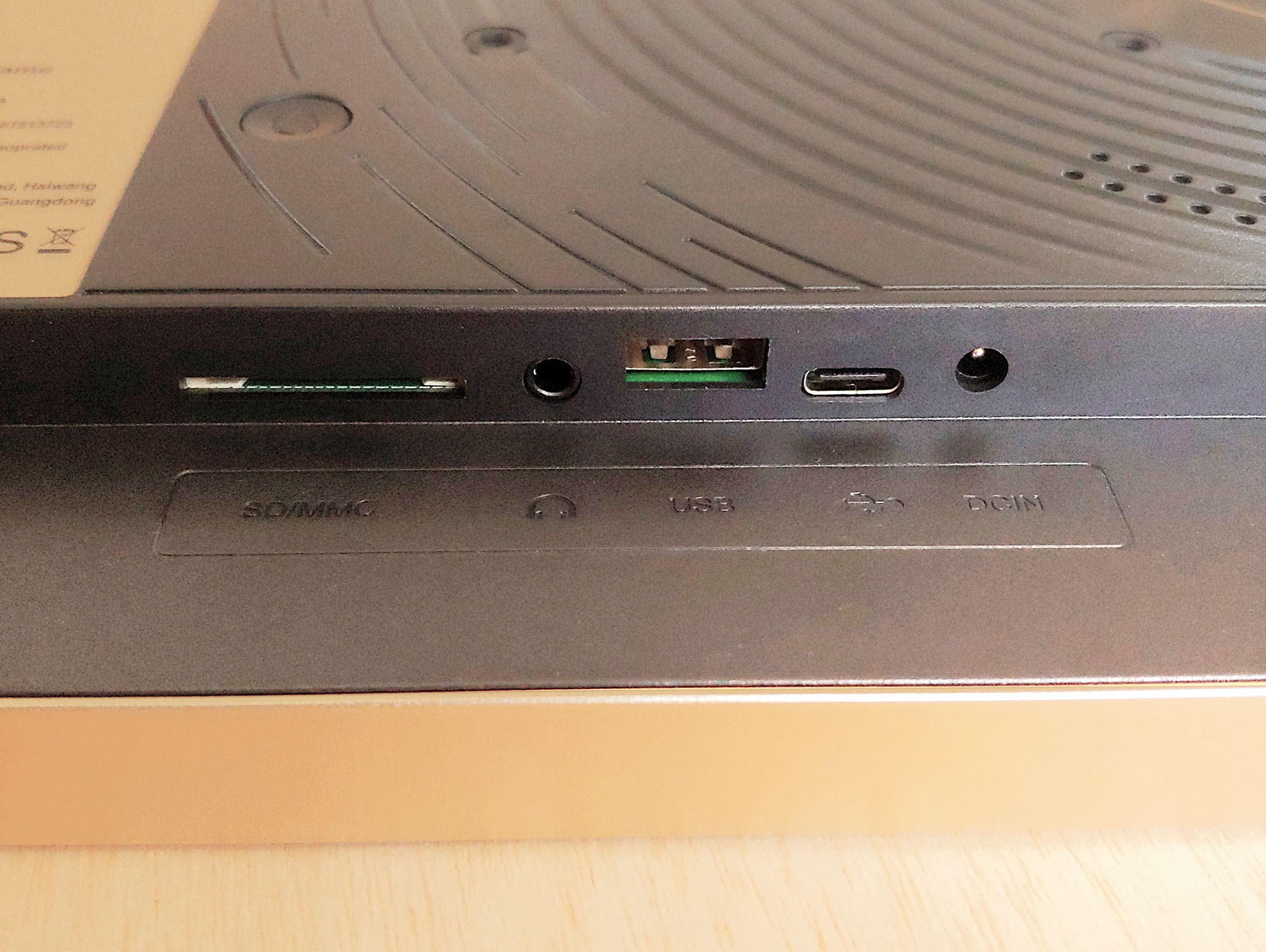Tutte le porte, comprese quelle di alimentazione, USB-A, USB-C, lo slot per schede SD e il jack per cuffie da 3,5 mm, si trovano sul retro. Non c'è un pulsante di accensione, quindi collegandolo si accende, e lo spegnimento o la sospensione vengono gestiti attraverso il menu.