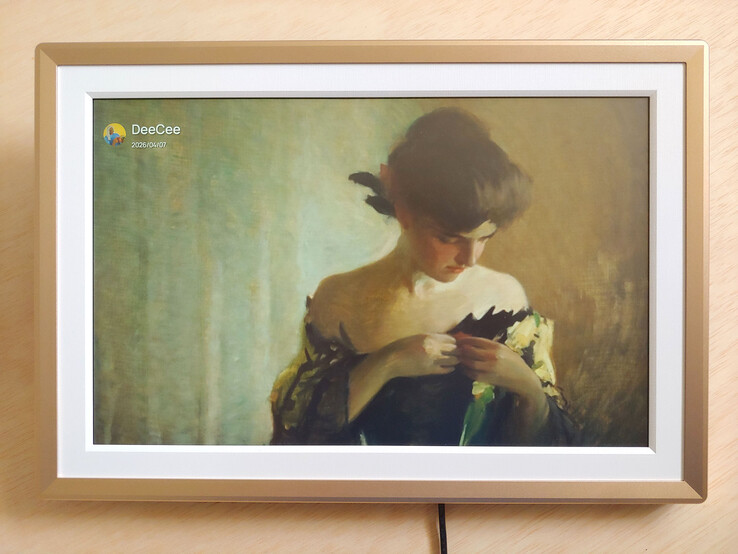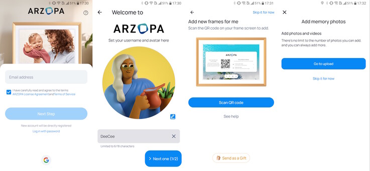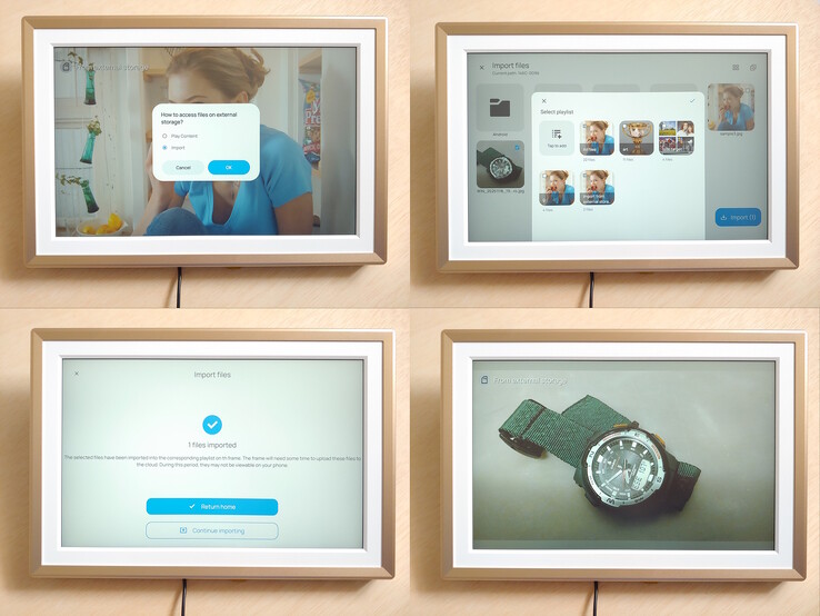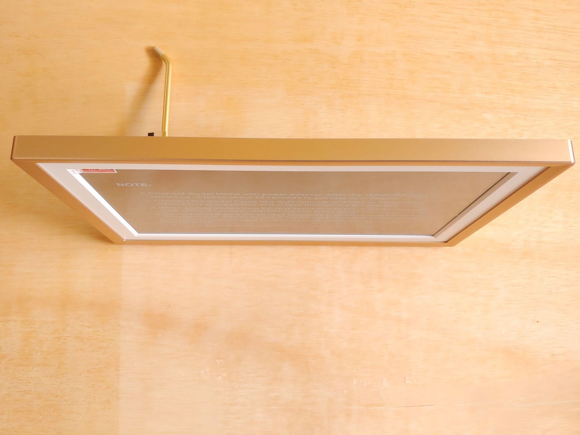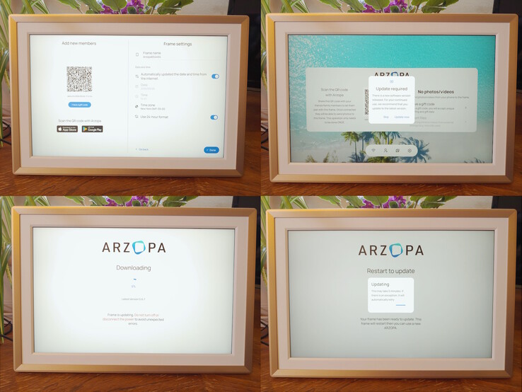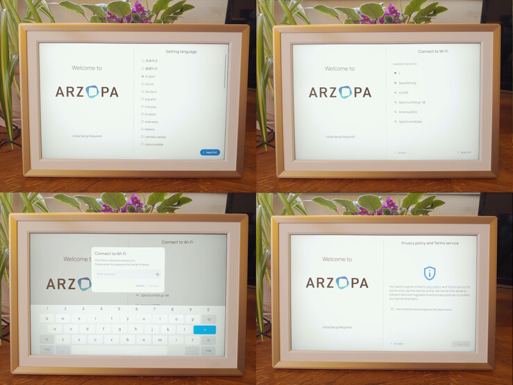 La configurazione iniziale dell'hardware consiste in diverse schermate, tra cui la selezione della lingua, l'impostazione opzionale del Wi-Fi, l'accettazione dei termini di servizio e delle norme sulla privacy e le impostazioni di data e ora. Gli utenti possono condividere il codice QR sullo schermo nell'ultima schermata con amici e familiari per accedere alla cornice o aggiungere un codice regalo per vedere le foto regalate, come quelle di un matrimonio. Sull'unità in prova era necessario un aggiornamento del firmware, che ha richiesto diversi minuti per essere installato.