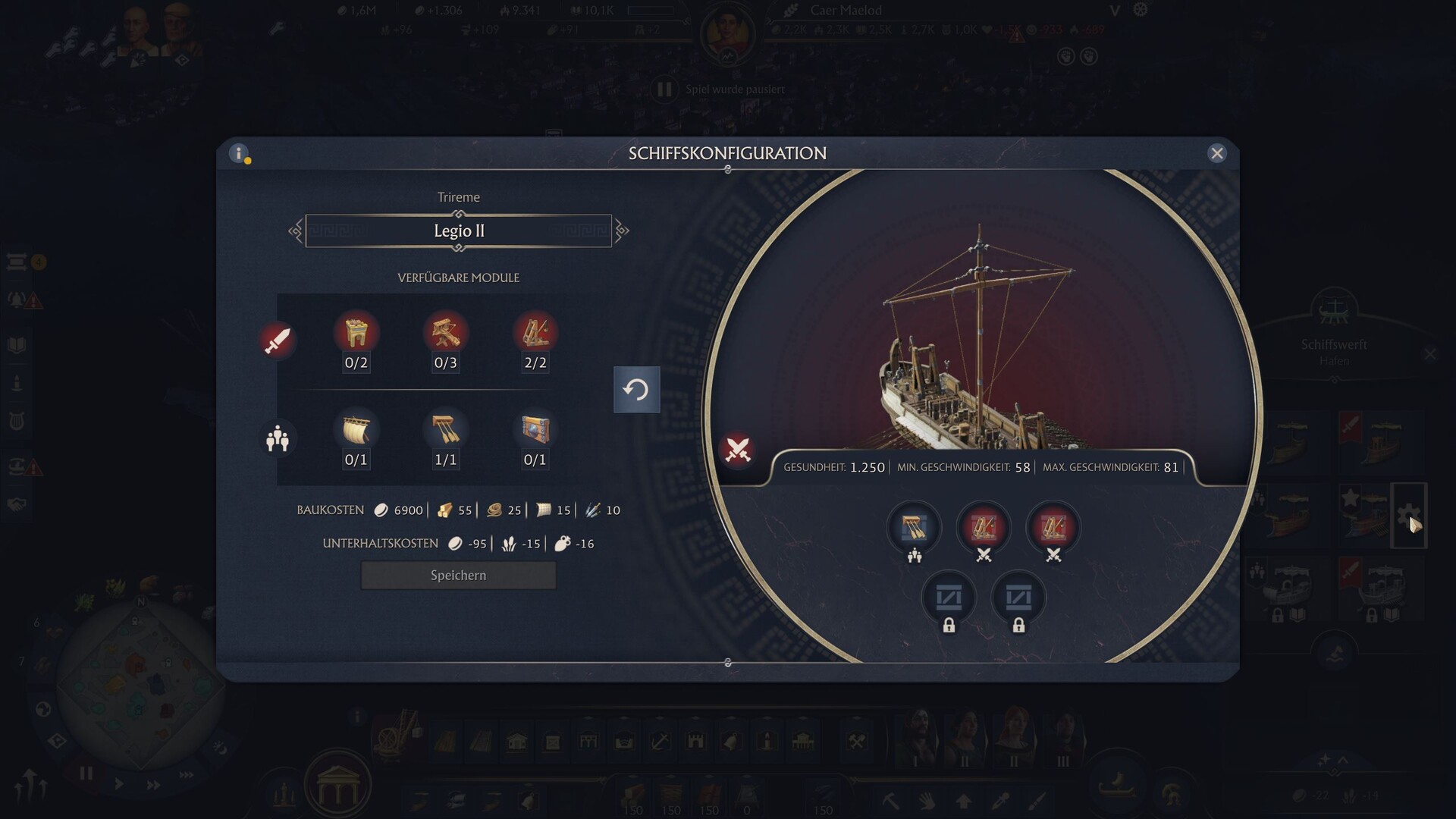 Il combattimento navale beneficia del design modulare delle navi. A seconda della nave, si possono collegare diversi moduli per renderla più efficace contro gli edifici, ad esempio. Durante la nostra recensione, siamo stati in grado di eliminare uno dei pirati più deboli e un altro pretore dell'IA tramite il combattimento terrestre. Il suo fratello pirata più forte nel Lazio ha accettato una tregua dopo costose battaglie, ma con la disapprovazione dell'imperatore. Le nostre azioni non solo influenzano le relazioni con gli altri governanti, ma anche la nostra posizione nei confronti dell'Imperatore, che nel peggiore dei casi può portare alla guerra.
