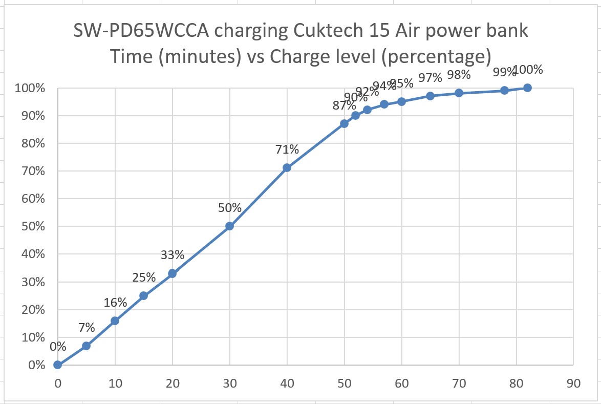 Un power bank Cuktech 15 Air (57,75 Wh) ha raggiunto la carica completa leggermente più velocemente - circa cinque minuti di differenza - con un Cuktech 10 Ultra (uscita USB-C da 100 watt max) rispetto a un SW-PD65WCCA (uscita USB-C da 65 watt max), utilizzando il cavo USB-C da 6A incluso. La velocità di carica non era lineare, perché la maggior parte delle batterie agli ioni di litio si caricano a una velocità maggiore dallo 0% all'80%, poi più lentamente fino al 100% per sicurezza.