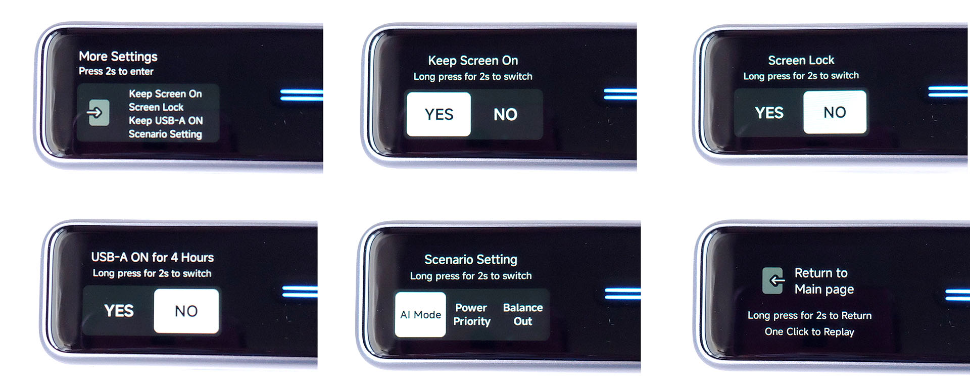 Quando visualizza le impostazioni, una pressione di due secondi alterna lo stato di ciascuna impostazione. L'impostazione principale da notare è la modalità di erogazione della potenza - AI, Priorità di potenza o Bilanciata.