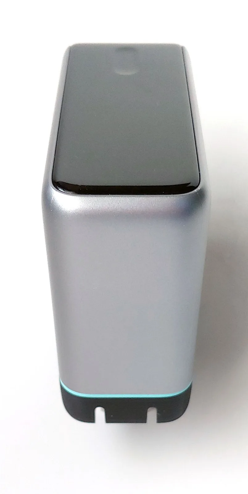 Il caricatore CA ha un design semplice con bordi curvi e lati piatti. Quattro porte USB sono allineate sul bordo anteriore - una porta USB-A e tre porte USB-C - mentre il display a colori e il pulsante a sfioramento si trovano nella parte superiore. Le prese AC estraibili si trovano nella parte inferiore. Nel complesso, ha un design di classe che è facile da afferrare e utilizzare con una sola mano.