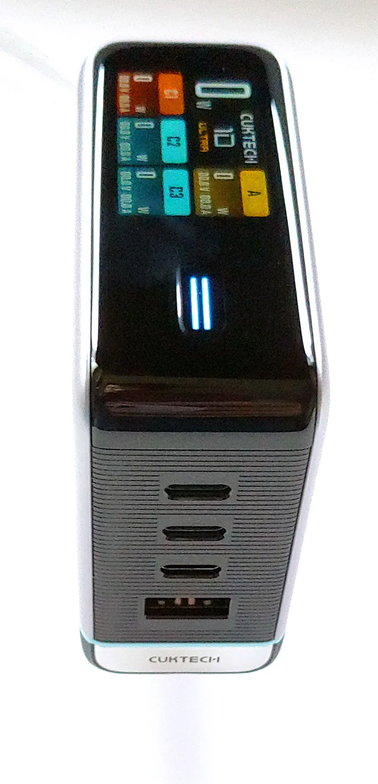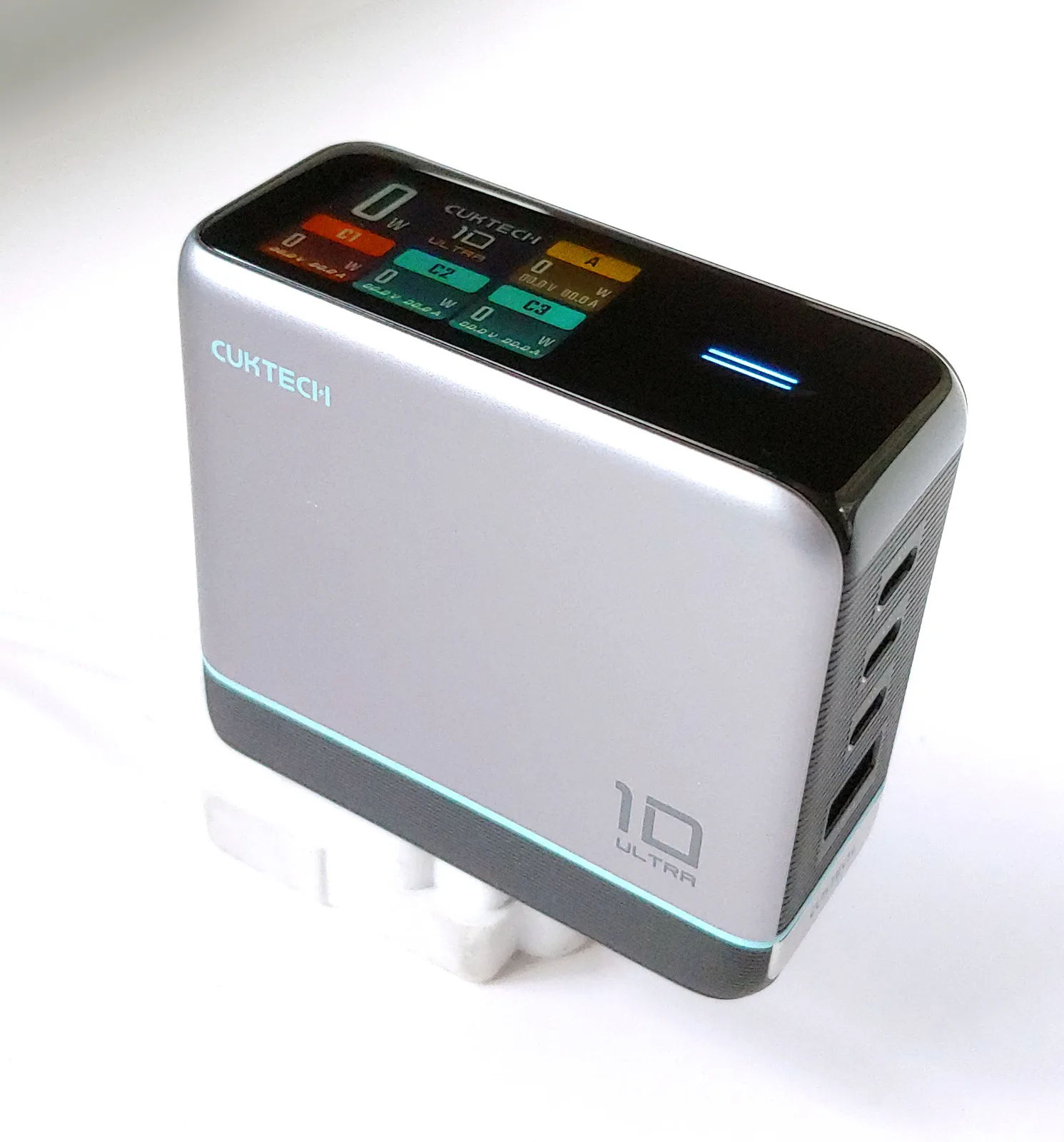 Cuktech 10 Ultra sostituisce comodamente i caricabatterie USB multipli e ricarica rapidamente fino a quattro dispositivi con una potenza combinata fino a 100 watt, fornendo al contempo informazioni sull'erogazione di energia per porta.
