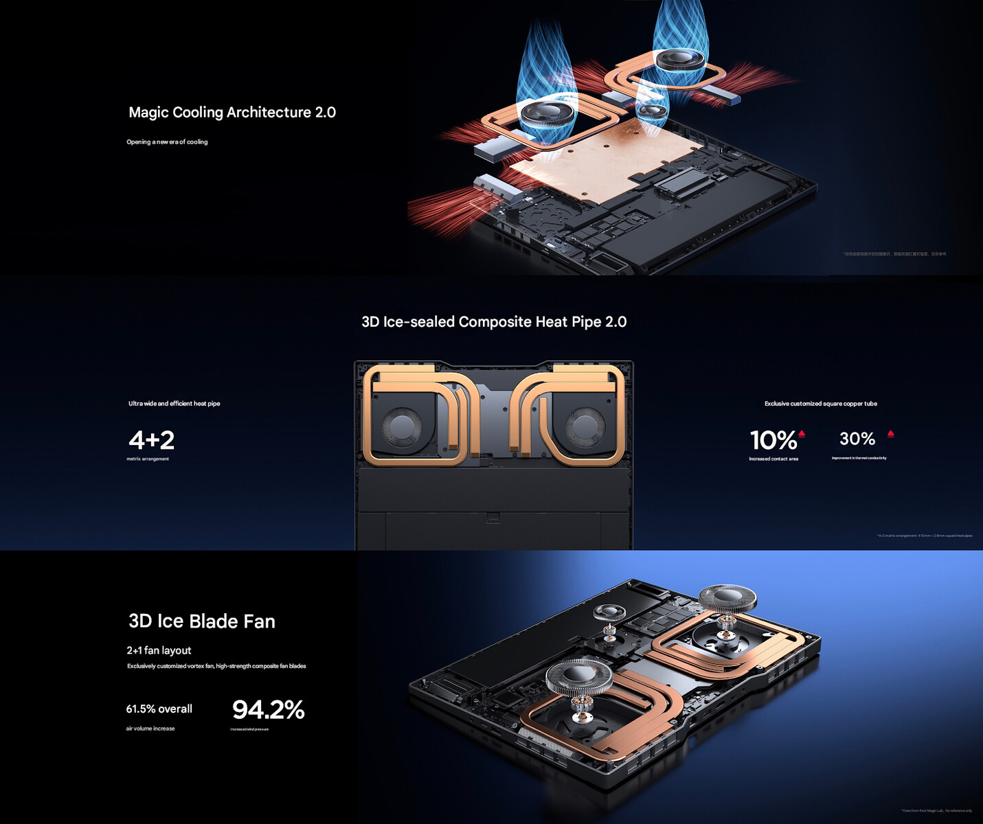 C'è un'altra opzione con la RTX 5080, una GPU per laptop di fascia alta capace. RedMagic sottolinea che la CPU e la GPU sono accoppiate con la Magic Cooling Architecture 2.0, che si dice mantenga il sistema fresco durante i carichi pesanti. Si sostiene che il design consenta un flusso d'aria più elevato rispetto al predecessore e che ci sia un totale di tre ventole attive.