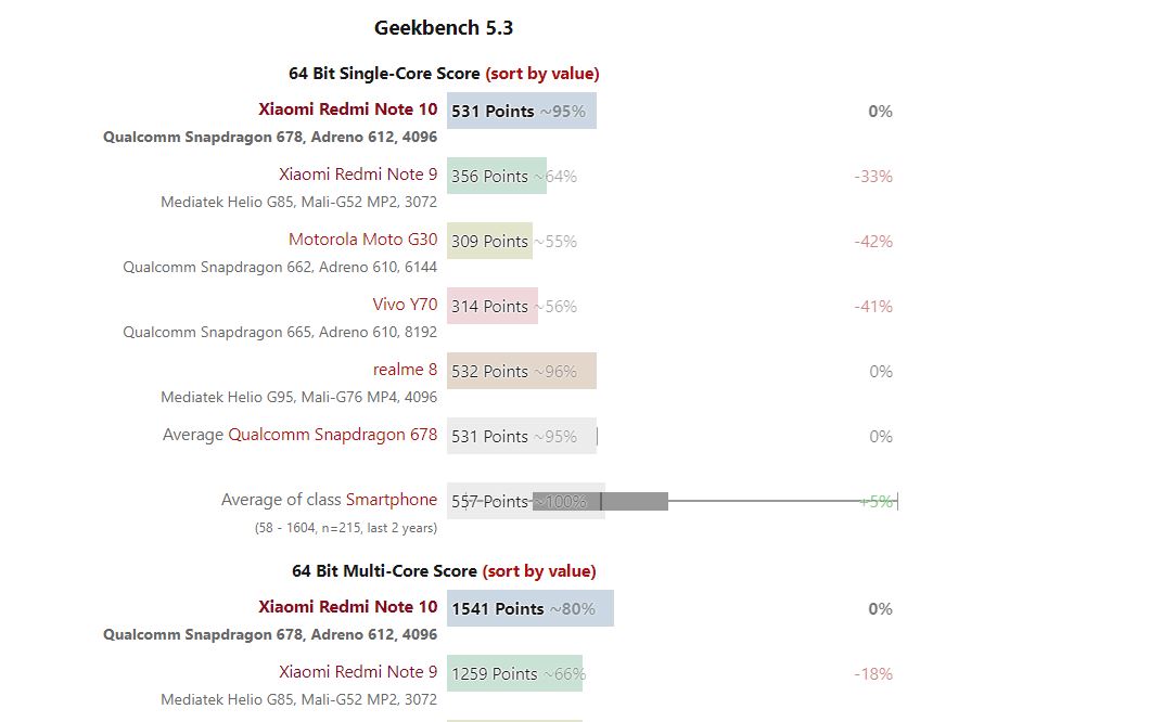 A questo punto, è sicuro concludere che il Redmi Note 10 e il suo Snapdragon 678 offrono circa il 30% di prestazioni migliori della CPU rispetto al Redmi Note 9. I ruoli sono invertiti nel reparto GPU, però, in quanto il vecchio telefono alimentato da MediaTek ha circa il 35% di vantaggio.