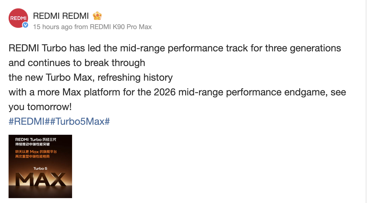 Ufficialmente, Xiaomi non ha ancora rivelato altro sul Redmi Turbo 5 Max. Tuttavia, anche MediaTek ha programmato un evento di lancio per il 15 gennaio, che inizierà alle 15:00 ora locale (07:00 UTC). Descritto come una 'sorpresa per i chip', si dice anche che l'evento segnerà l'inizio di una nuova Dimensità 'Dual Chip Global Dominance'. Di conseguenza, i leaker come Smart Pikachu affermano che i due eventi sono collegati e che Xiaomi presenterà domani il Redmi Turbo 5 Max come primo smartphone con supporto Dimensity 9500s.