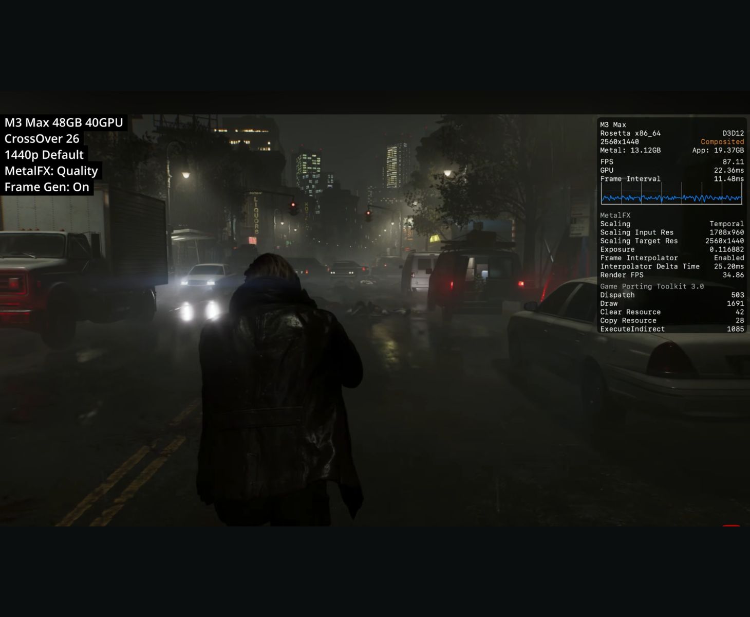 Le macchine più recenti vanno molto meglio. Il gioco è stato eseguito su un M3 Max MacBook Pro con 48 GB di memoria unificata e una GPU a 40 core attraverso CrossOver 26. A 1080p nativi con impostazioni grafiche predefinite, MetalFX disattivato e generazione di fotogrammi disattivata, il sistema ha mantenuto circa 70 FPS in una scena di strada aperta, dimostrando che l'hardware è in grado di gestire comodamente il gioco senza affidarsi all'upscaling. L'overlay mostra anche l'esecuzione del titolo attraverso il livello Game Porting Toolkit di Applecon tempi di frame di circa 14 ms, pur utilizzando circa 10,5 GB di memoria della GPU.