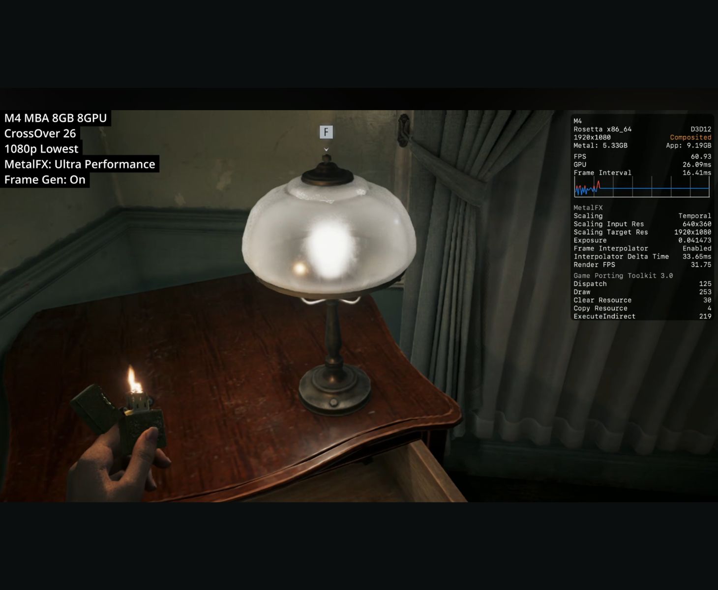 Sul più economico MacBook Air alimentato dal chip M4il gioco può ancora funzionare con alcune regolazioni. Il gioco è stato impostato a 1080p con il preset grafico più basso, mentre sono stati attivati l'upscaling e la generazione di fotogrammi MetalFX Ultra Performance. In questa configurazione, il gioco raggiunge circa 60 FPS, con tempi di frame vicini ai 16 ms. L'overlay mostra anche un FPS di rendering di circa 31-32 FPS, il che indica che la generazione di fotogrammi aiuta a incrementare il frame rate finale. L'utilizzo della memoria della GPU è di circa 5,3 GB, mentre la memoria dell'applicazione è di circa 9,1 GB.