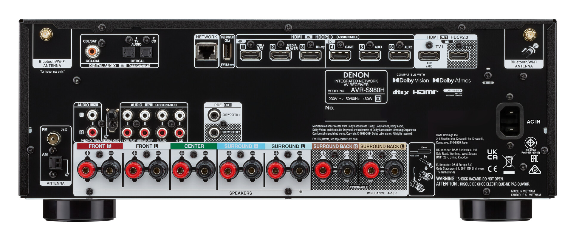 Denon promette una facile configurazione in pochi passi per l'AVR-S980H, con l'obiettivo di portare il suono dell'home cinema nel salotto senza complicazioni. Il sintoamplificatore AV offre 7.2 canali a questo scopo; se utilizzato con Dolby Atmos, può, ad esempio, essere utilizzato in una configurazione a 5.2.2 canali con due subwoofer e due diffusori a soffitto. L'amplificatore fornisce 90 watt per canale, che dovrebbero rappresentare una potenza sufficiente per l'home cinema del salotto.