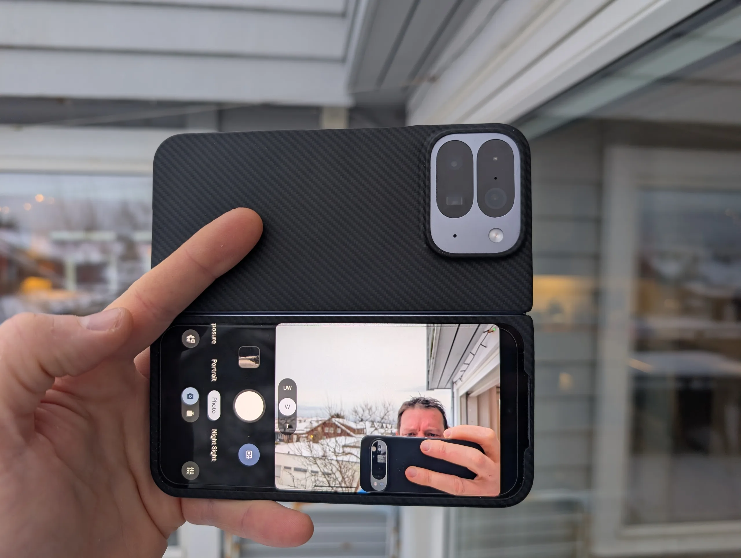 Detto questo, uno dei maggiori punti di forza per me è stata la possibilità di utilizzare le fotocamere posteriori come fotocamere per selfie quando il dispositivo è aperto. Anche in questo caso, si tratta di qualcosa che sulla carta potrebbe essere molto attraente, ma che in realtà è quasi del tutto impraticabile. Mi ci sono volute diverse settimane per sviluppare quella che io chiamo la presa "corna del diavolo". L'unico modo pratico per tenere il telefono e scattare un selfie contemporaneamente, riducendo in qualche modo il rischio di far cadere un investimento di 1.800 dollari.