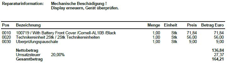 Mercoledì 19 giugno abbiamo ricevuto per posta il preventivo di riparazione promesso. La riparazione dello schermo sarebbe costata esattamente 164,21 euro (~$183,02). Anche se questo ha superato leggermente l'importo dichiarato verbalmente, era ancora all'interno del nostro budget per i test. Abbiamo immediatamente accettato il costo ed è stato fatto un ordine di riparazione vincolante, o almeno così pensavamo.