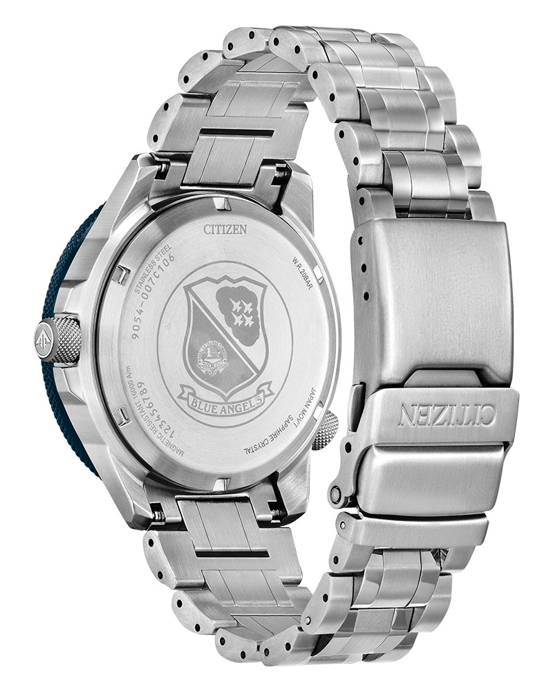 Il logo dei Blue Angels è stampato sul quadrante e inciso sul fondello. Il fondello inciso è mostrato chiaramente nelle immagini trapelate, insieme alle indicazioni di riferimento e di impermeabilità del modello. La corona e il comando secondario a ore due utilizzano texture metalliche zigrinate. All'interno dell'orologio c'è il Calibro Citizen 9054un movimento automatico GMT con hacking dei secondi e la possibilità di regolare in modo indipendente la lancetta delle ore locali quando si viaggia. L'orologio è dotato di un vetro zaffiro e di un bracciale in acciaio inossidabile con chiusura a pulsante con marchio inciso. La resistenza all'acqua è quotata a 200 metri.