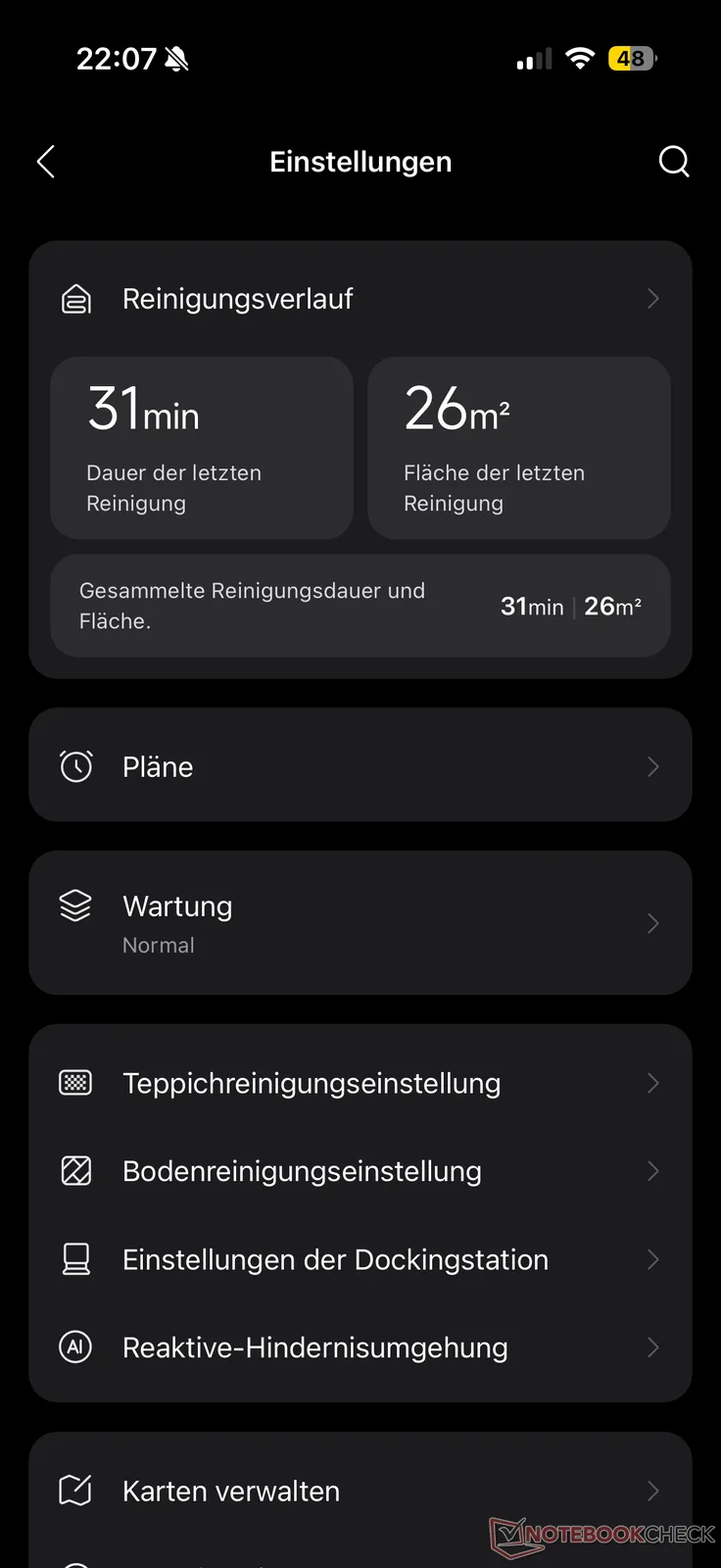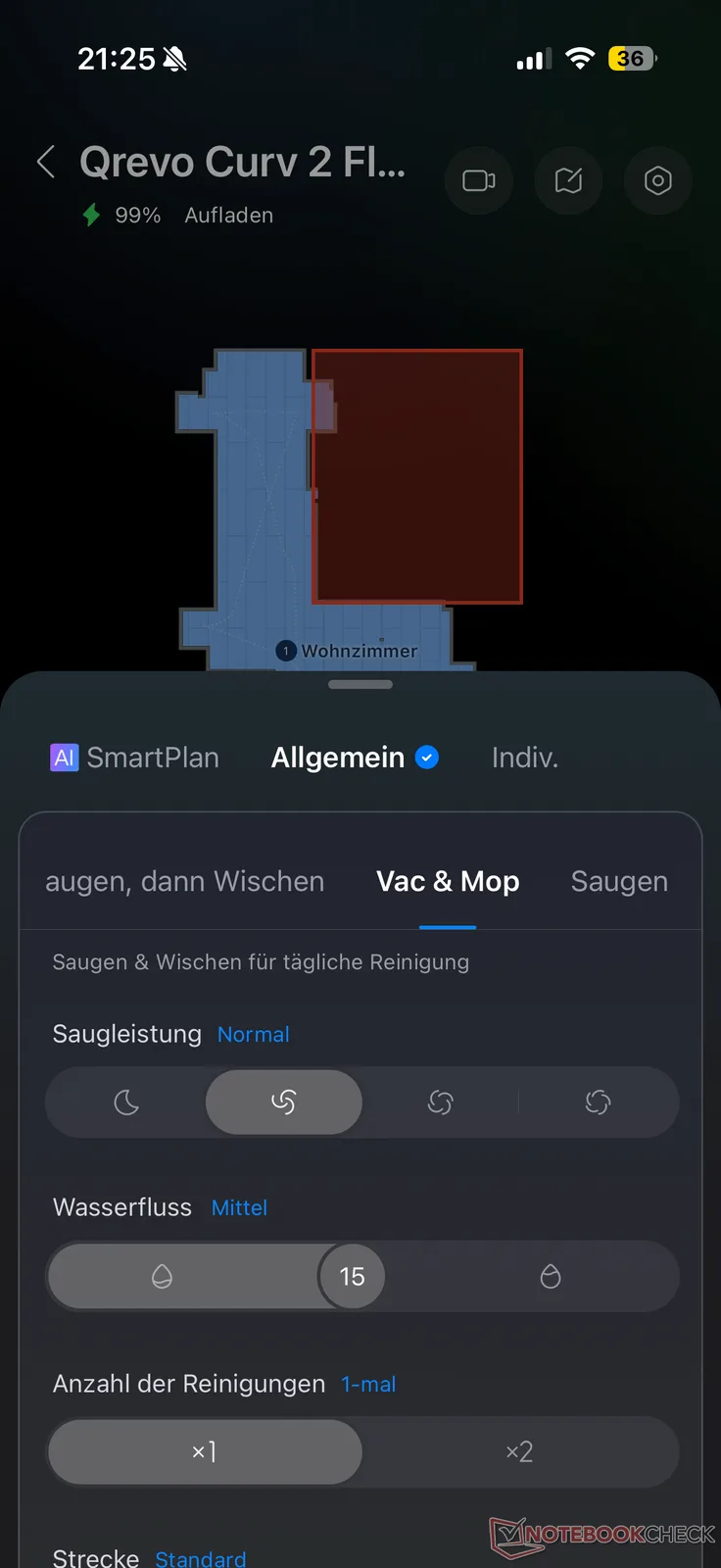 Come al solito, ci sono molte opzioni disponibili per le impostazioni di pulizia, che conosciamo già dal Qrevo Curv 2 Pro e da altri modelli Roborock. Tuttavia, ci mancava una modalità di sola pulizia. Questa non viene offerta, cosa che a nostro avviso avrebbe senso per un aspirapolvere robot che si concentra sulle prestazioni di pulizia. Invece, oltre alla regolazione individuale e all'"AI SmartPlan" con regolazione automatica dell'AI, il Qrevo può opzionalmente "Aspirare, poi passare il mop", "Aspirare e passare il mop" e "Aspirare". La potenza di aspirazione può essere regolata in quattro fasi e l'umidità di lavaggio in 30 fasi.