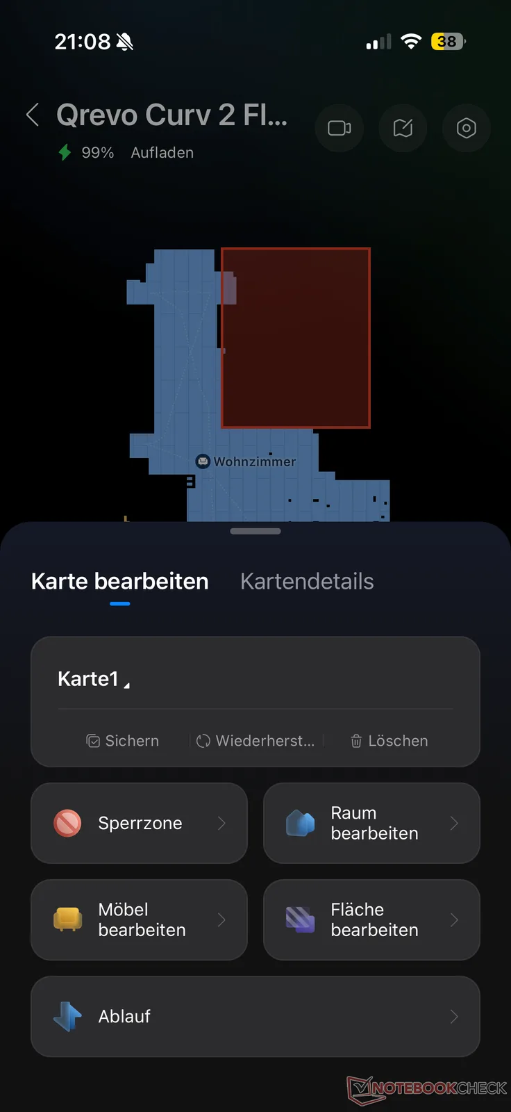 Il Qrevo Curv 2 Flow ha scansionato in modo affidabile l'ambiente circostante e ha creato una mappa virtuale in pochi minuti. Questo era già abbastanza buono in termini di distribuzione spaziale. Con una piccola rielaborazione, comprese le zone di esclusione opzionali, la configurazione è stata completata in circa 10-15 minuti.