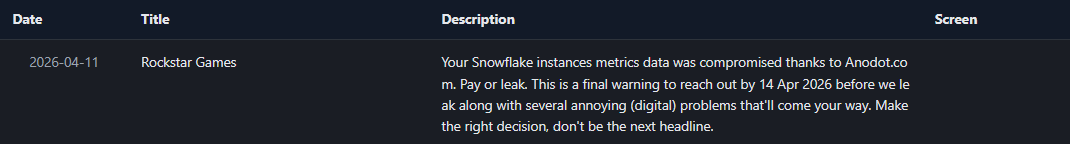 Secondo RansomLook.io e CyberSec Gurugli aggressori non hanno compromesso direttamente il perimetro di Rockstar. Invece, hanno presumibilmente sfruttato un'integrazione automatizzata attraverso Anodot, una piattaforma di monitoraggio cloud-cost di terze parti. Il gruppo sostiene di aver ottenuto l'accesso all'ambiente Snowflake di Rockstar (che l'azienda utilizza per archiviare e gestire, tra gli altri dati, i dati analitici e la telemetria dei giocatori) raccogliendo i token di autenticazione da Anodot. Con questo metodo, gli aggressori possono aggirare l'autenticazione multifattoriale standard utilizzando token di servizio legittimi che rimangono validi per periodi prolungati. Questo tipo di vulnerabilità della catena di approvvigionamento sembra essere diventato un vettore primario per gli ShinyHunters tra la fine del 2025 e l'inizio del 2026.