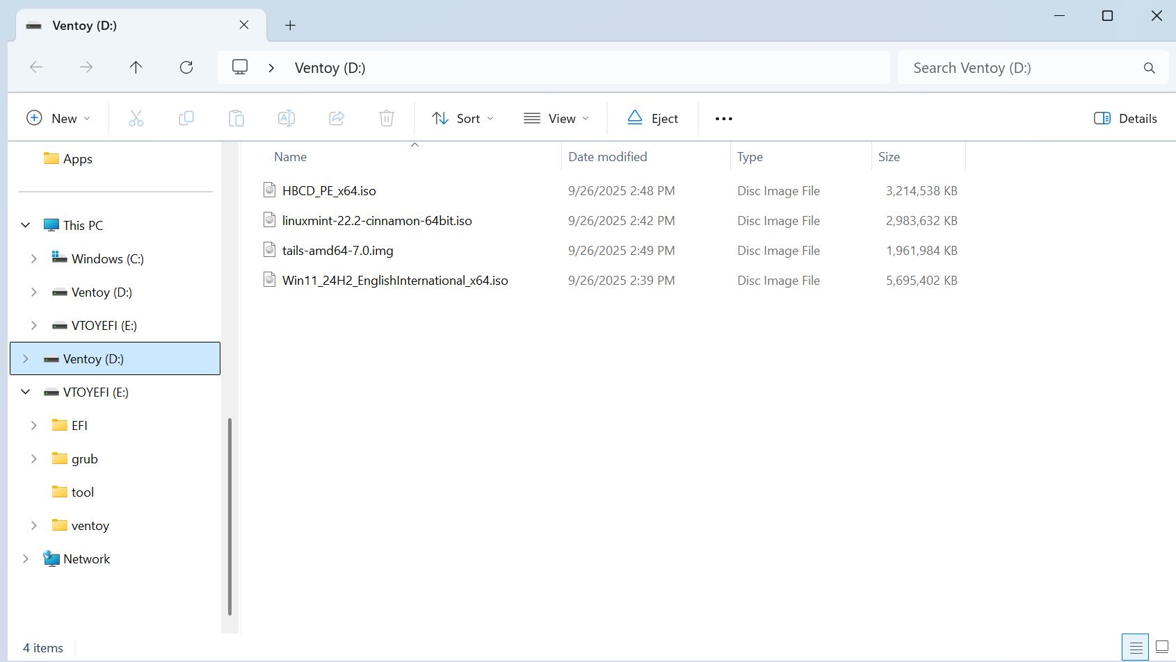 In questo modo, una singola chiavetta di avvio USB può contenere un'immagine di Windows 11, più distribuzioni Linux, strumenti di salvataggio, Tails o altri sistemi operativi. E se desidera sostituire un'immagine, basta eliminare quella vecchia e aggiungerne una nuova, senza dover configurare nuovamente la chiavetta. Per me, è lo strumento di flashing di immagini perfetto per le ISO dei sistemi operativi. Ventoy funziona sia su Windows che su Linux, può scaricarlo qui gratuitamente.