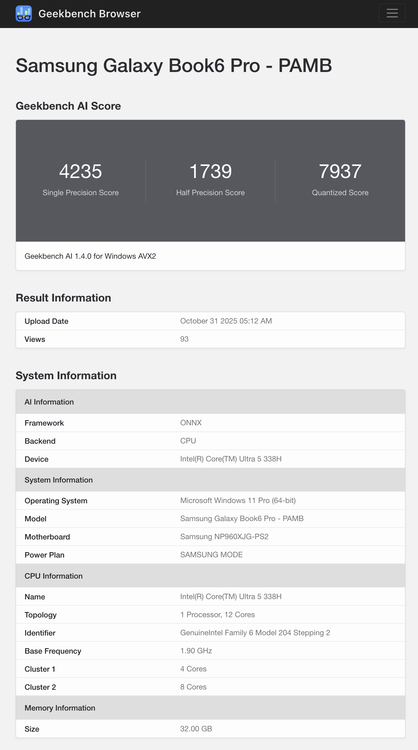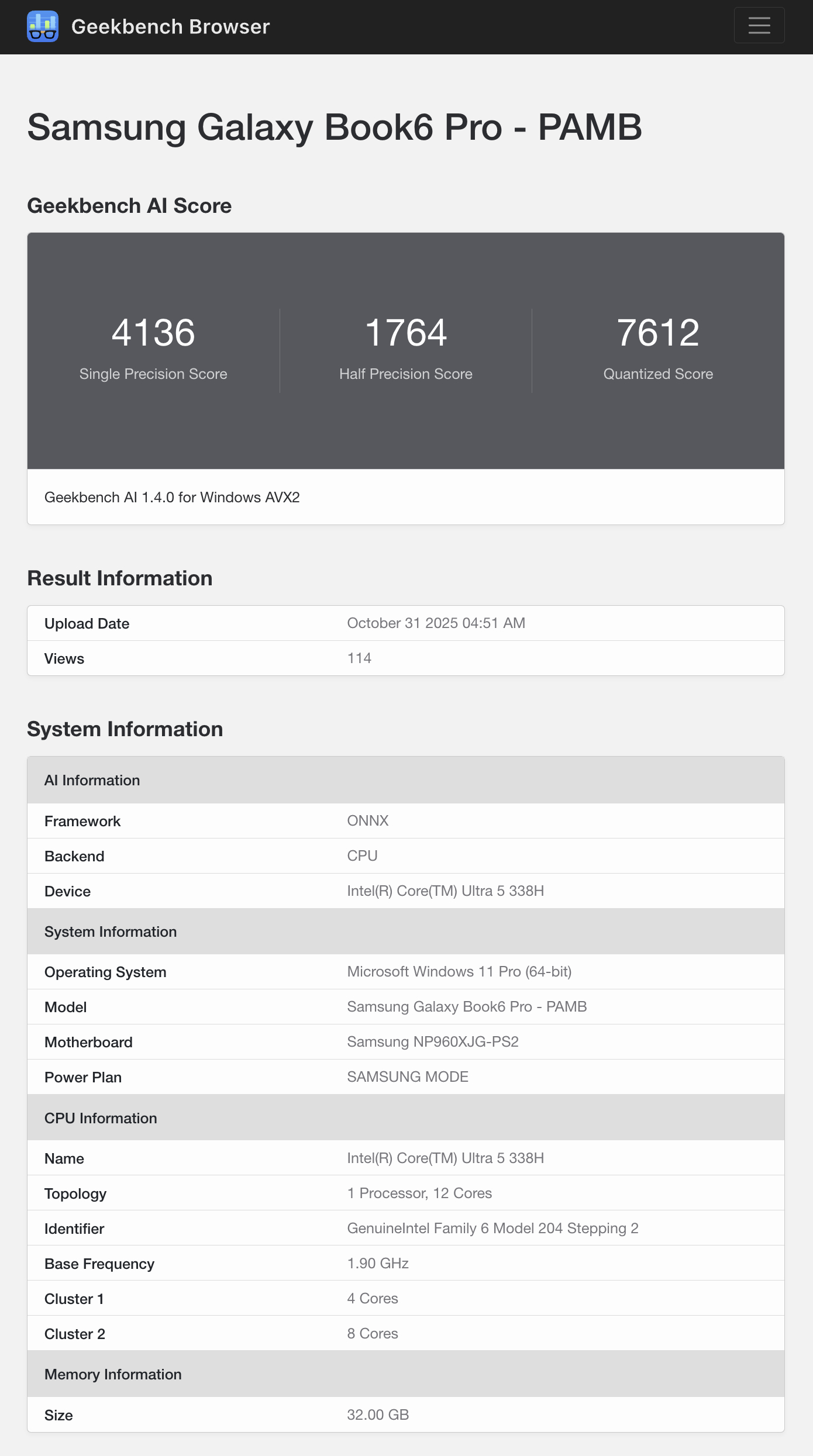 A quanto pare, questi miglioramenti architettonici e di produzione aumenteranno anche le prestazioni, che non sono il punto forte di Lunar Lake al di fuori dei compiti pesanti per la GPU. A tal fine, il Core Ultra 5 338H supera facilmente anche il Core Ultra 9 288V nel benchmark Geekbench AI 1.4.0, in parte aiutato anche dai 32 GB di RAM presenti. Sulla base di recenti fughe di notizie, all'aumento della CPU dovrebbero aggiungersi anche i guadagni della GPU, grazie alle iGPU Xe3 di Intel.