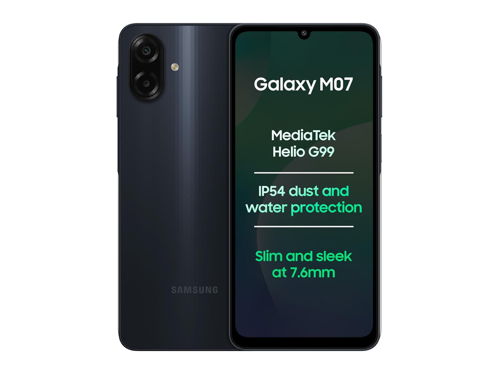EN→ITThe Samsung Galaxy M07 was announced on October 1, 2025, and released the same day, aiming to offer a budget-friendly option with solid everyday performance. It comes in a sleek black color, weighing 184 grams and measuring 167.4 x 77.4 x 7.6 mm, making it comfortable to hold. The phone has a glass front with a plastic back and frame, and it carries an IP54 rating, which provides basic dust protection and splash resistance. The phone sports a 6.7-inch PLS LCD display with a 720 x 1600 pixels resolution and around 262 ppi density. While the resolution is modest, the 90Hz refresh rate ensures smooth scrolling and a decent visual experience for daily use. Peak brightness is enough for indoor and moderate outdoor use, though it may struggle under direct sunlight.