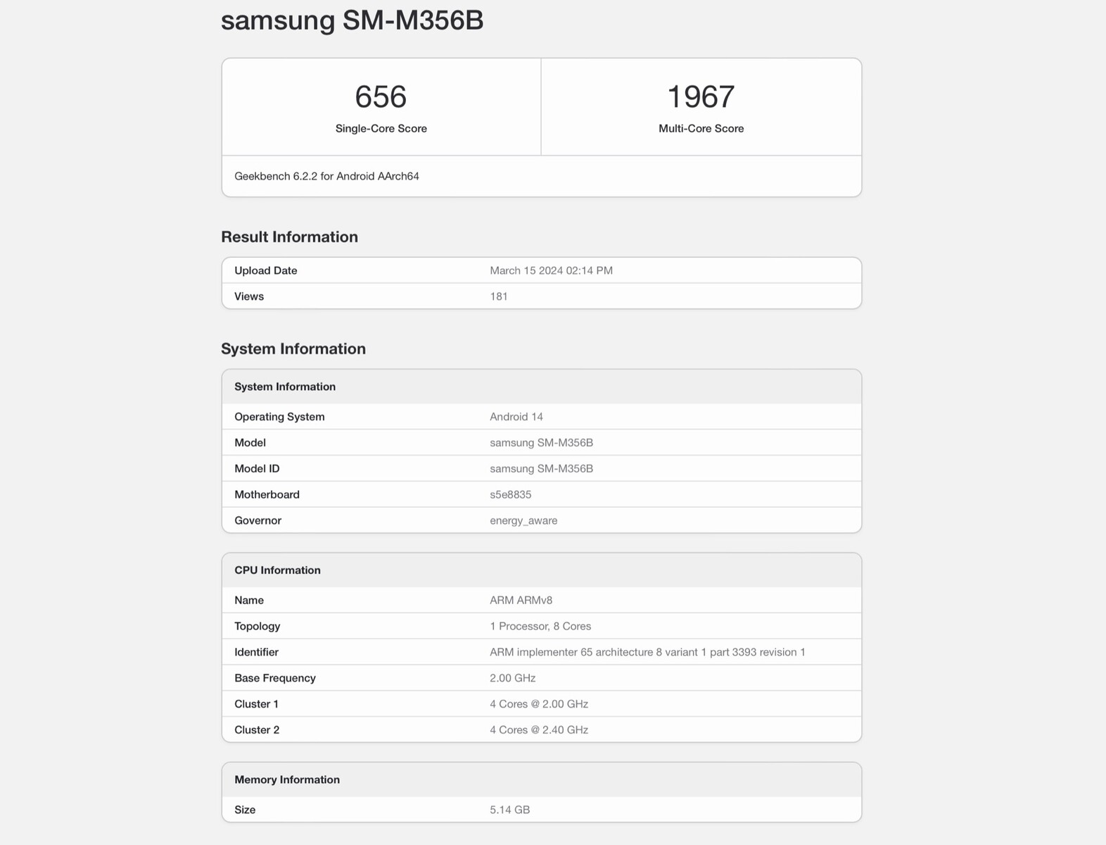 Secondo le indiscrezioni, Galaxy M35 5G ha un display AMOLED da 6,6 pollici con risoluzione 1080p+ e una frequenza di fotogrammi di 120 Hz, una fotocamera principale da 50 MP con stabilizzazione ottica dell'immagine (OIS), una fotocamera ultra-grandangolare da 5 MP, una fotocamera macro da 2 MP e una fotocamera selfie da 13 MP. Non sono ancora noti i dettagli sul prezzo e sulla data di lancio di Samsung Galaxy M35 5G.