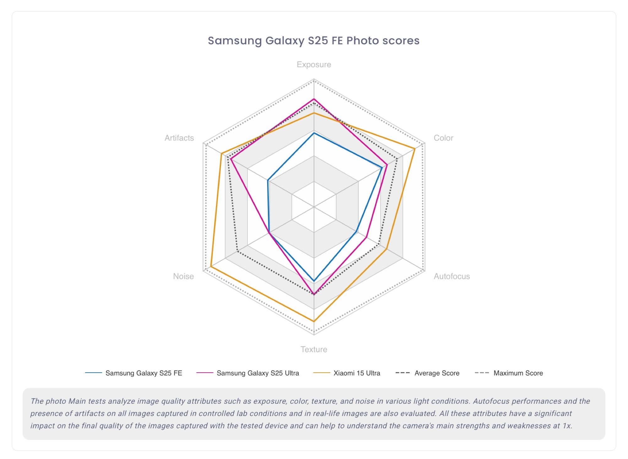 Il Galaxy S25 FE include uno scatto principale da 50 MP f/1.8 con un sensore da 1/1.57 pollici, una fotocamera ultrawide da 12 MP f/2.2 con un minuscolo sensore da 1/3 di pollice e un teleobiettivo da 8 MP f/2.2 con un sensore ancora più piccolo da 1/4.4 pollici e zoom ottico 3x. L'analisi approfondita della fotocamera di DxOMark ha rivelato l'effettiva portata dei compromessi di questa configurazione a tre fotocamere. Con un punteggio di 118, Galaxy S25 FE si posiziona al 123° posto nella classifica globale di https://www.dxomark.com/smartphones/ - superato persino dall'iPhone 12 Pro Max di Apple cinque anni fa (131 punti) e dal più economico Google Pixel 6a (122 punti)
