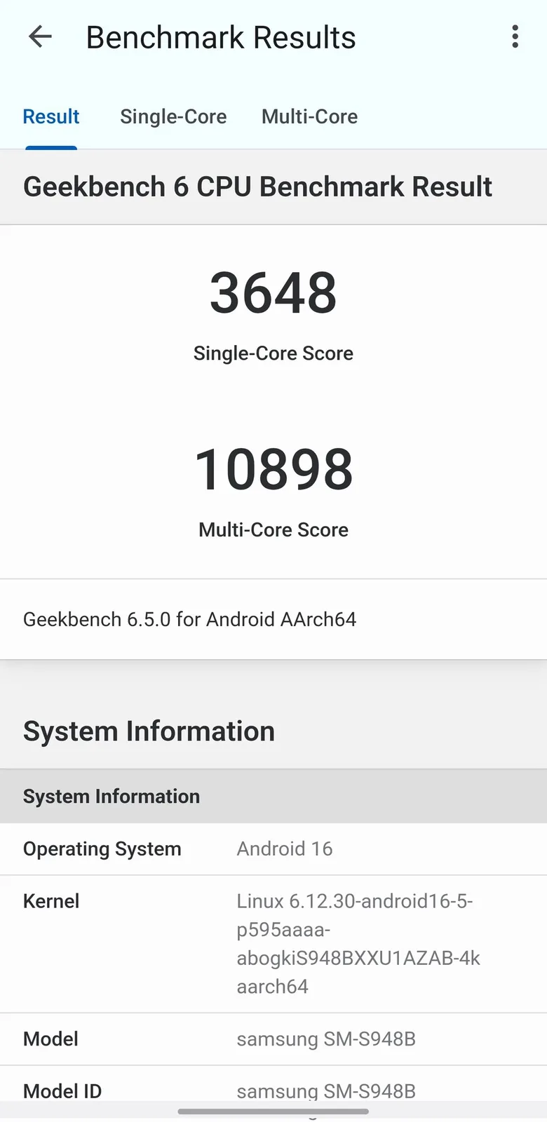 Come condiviso da Sahil Karoul, Galaxy S26 Ultra ottiene un punteggio single-core di 3.648 su Geekbench 6, e un punteggio multi-core di 10.898. Entrambi questi numeri sono decisamente nella media rispetto allo Snapdragon 8 Elite Gen 5 che abbiamo testato, e alcuni potrebbero considerarli deludenti. Dopo tutto, Galaxy S26 Ultra è dotato di una variante di Snapdragon 8 Elite Gen 5 con core principali che funzionano fino a 4,74 GHz, rispetto ai 4,61 GHz della versione standard del chipset.